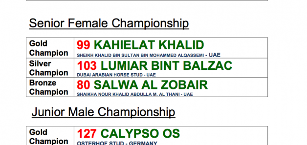 حيث تم الغاء نتيجة وصيفة بطولة الافراس صاحبة الجائزة الفضية الفرس ماجورا من إسطبلات الخالدية وتم تغيير النتائج لتحل الفرس لومير بنت بلزك المملوكة لمربط دبي بمركز “البطلة الفضية” وتصعد الفرس سلوى الزبير المملوكة لمربط الزبير لتصبح “البطلة البرونزية” ،