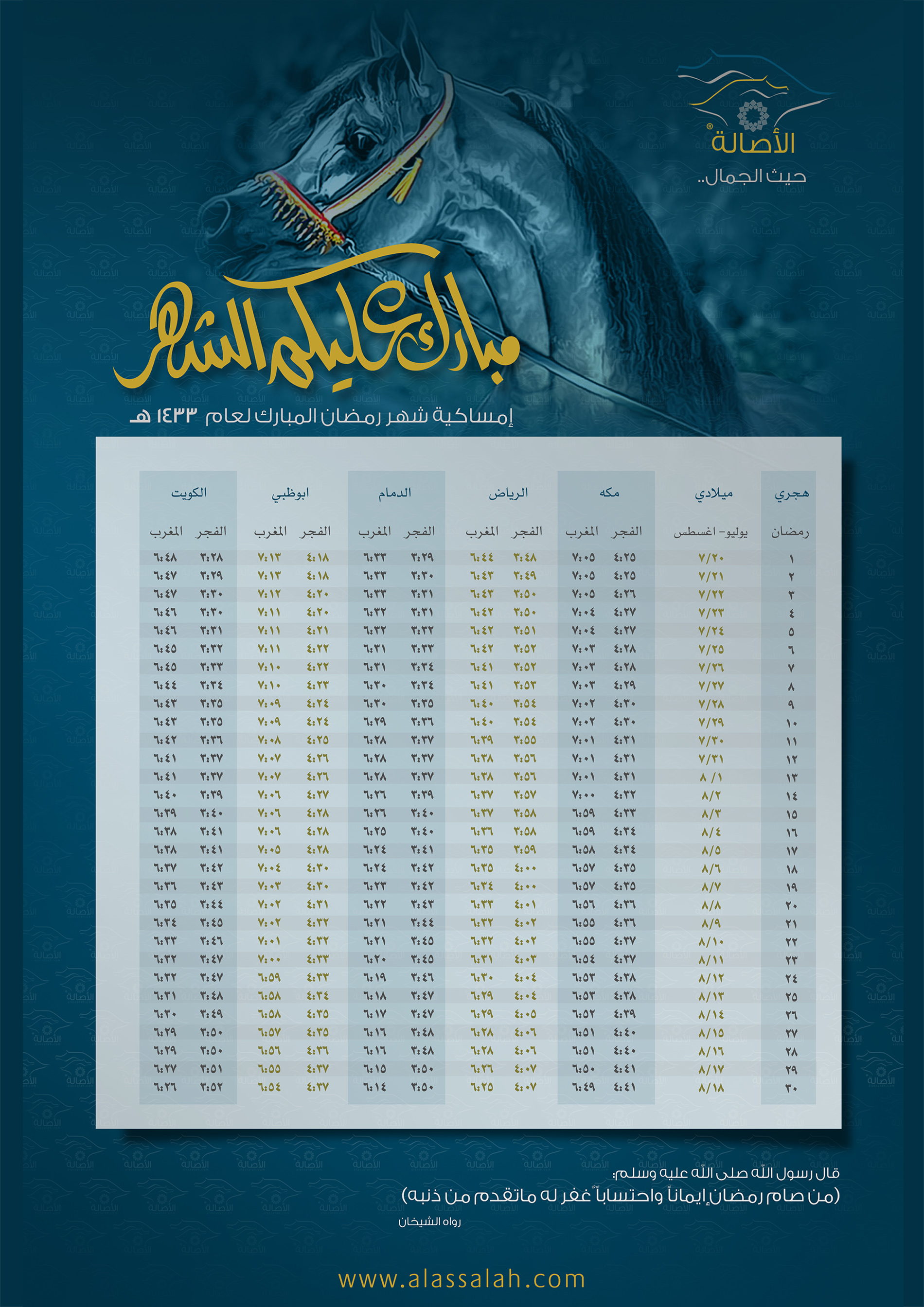 وبهذه المناسبة نرفق لكم هدية خاصة إمساكية شهر رمضان المبارك لعام ١٤٣٣ هـ لكل من المدن التالية: مكة المكرمة، الرياض، الدمام، ابوظبي، الكويت.