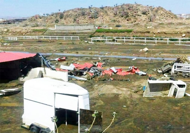 عن ثلاثين بائكة خيل ومعدات نقل وسيارات مما أدى إلى نفوق عدد كبير من الخيل العربية وفقدان بعضها منجرفة مع السيل واصاباة المتبقى بإصابات بليغة، نسأل المولى القدير أن يعوض مالك هذه الخيل الأصايل خيراً مما فقد، وأن يلهمه الصبر على مافقد.