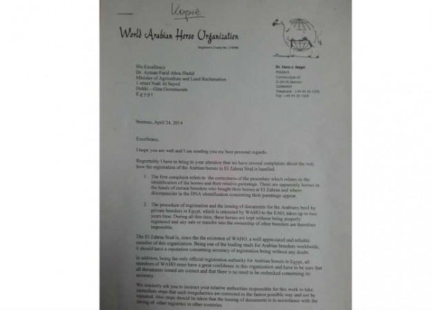 وكان الوزير قد تلقى خطابا من الدكتور هانز ناجل رئيس المنظمة العالمية للحصان العربي “الواهو” يؤكد فيه تلقى شكاوى بشأن الطريقة المتبعة لتسجيل الخيول العربية في مربط الزهراء.