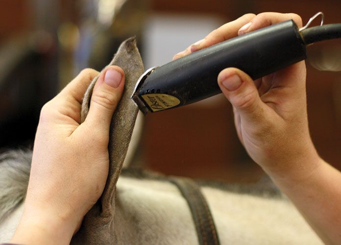 إذا كان لديك مقصات اللمسات النهائية، فأبقيها للمرحلة التالية، لأنها مفيدة جدا لحلق الأذنين لسهولة التعامل معها لحلق الخيول. وإذا لم تكن لديك هذه المقصات، فاستخدم شفرات مقاس 00000 أو 40. وربما تحتاج إلى شد الحصان بقوة في هذه المرحلة، ولكن إذا أبطأت في عملك وتلطفت فسوف يكون كل شيء على ما يرام.