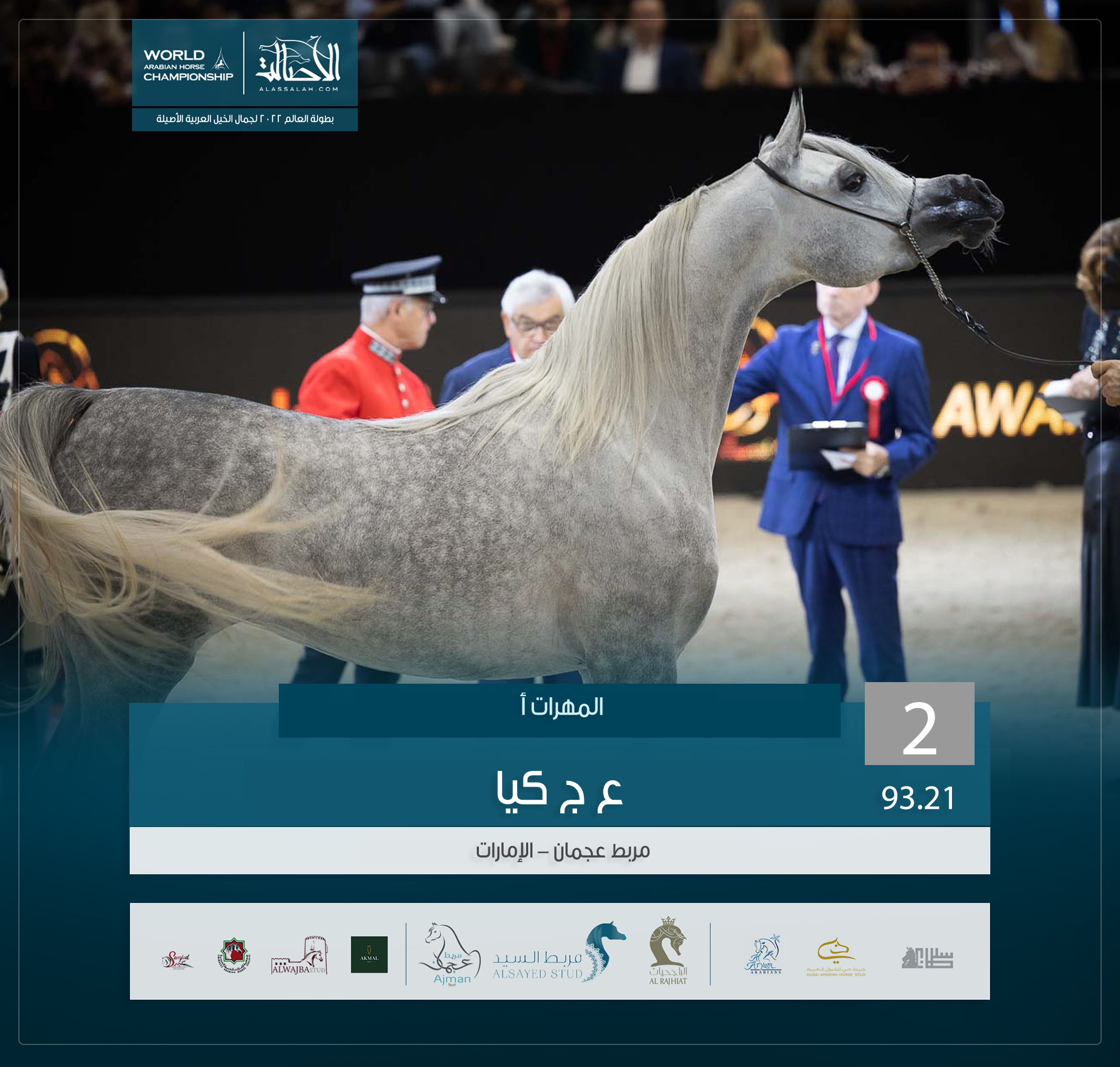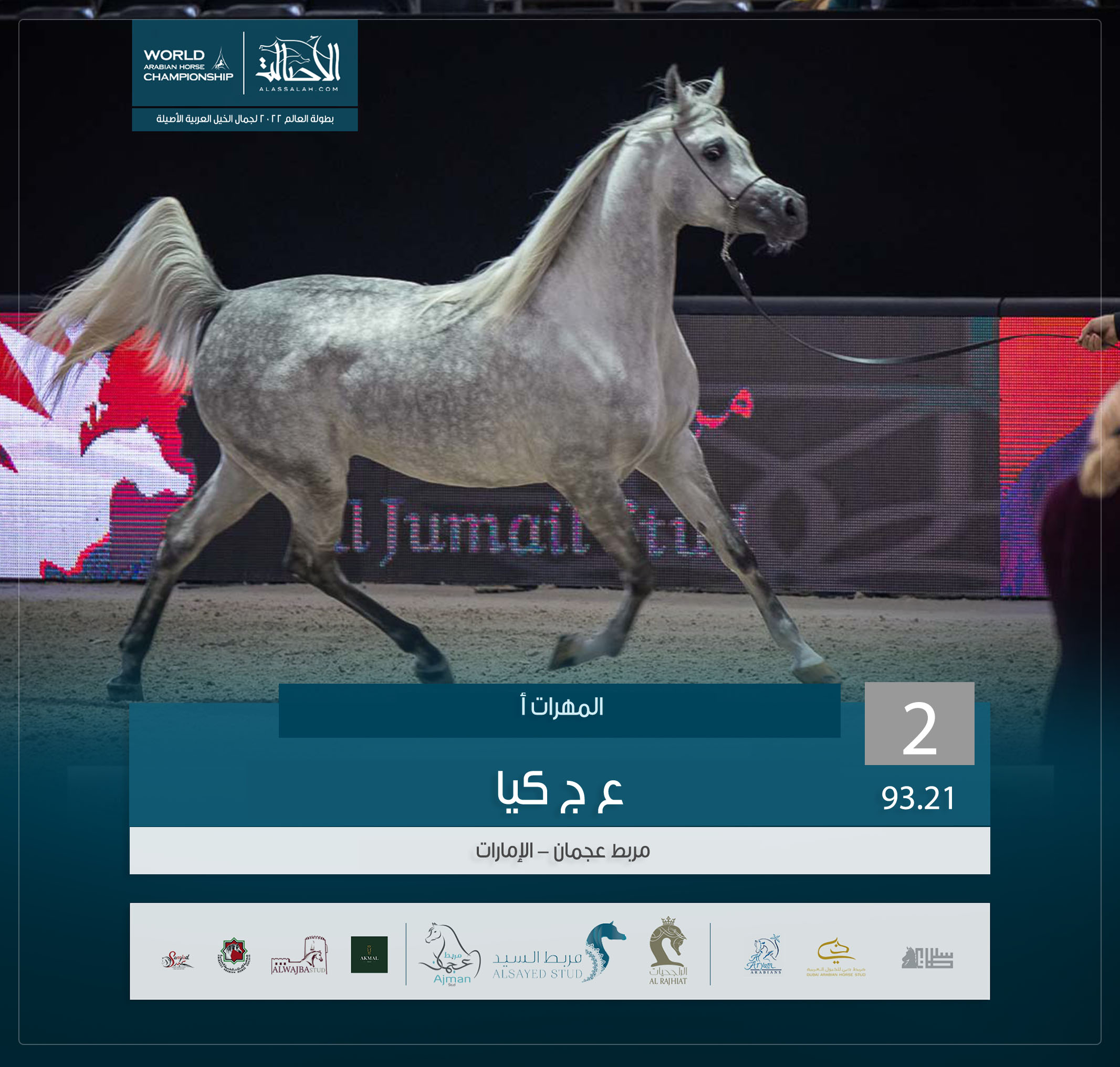 المركز الثاني: ع ج كية (ع ج كفو x اجا كابريس) مربط عجمان– الإمارات الدرجة:93.21