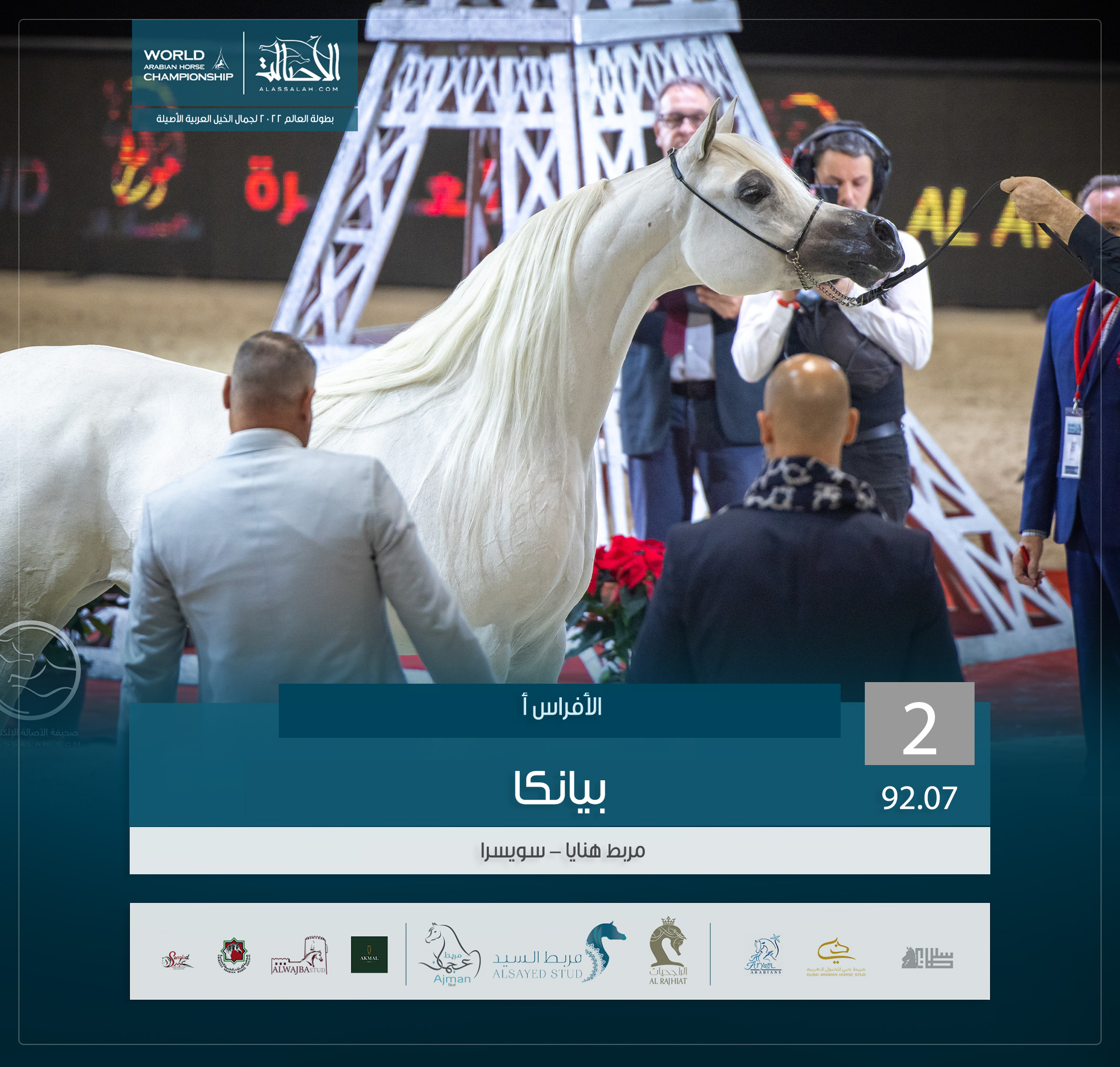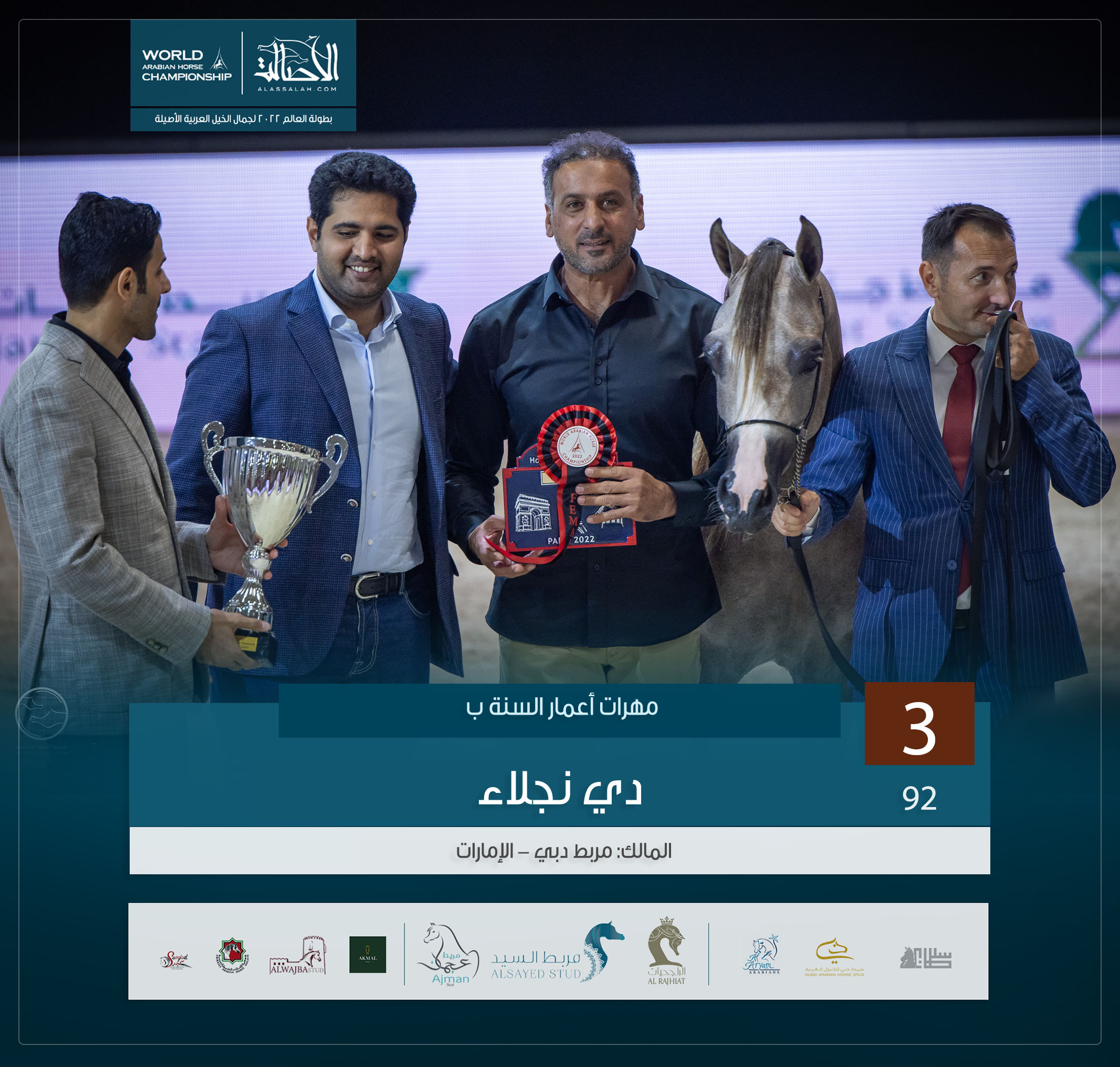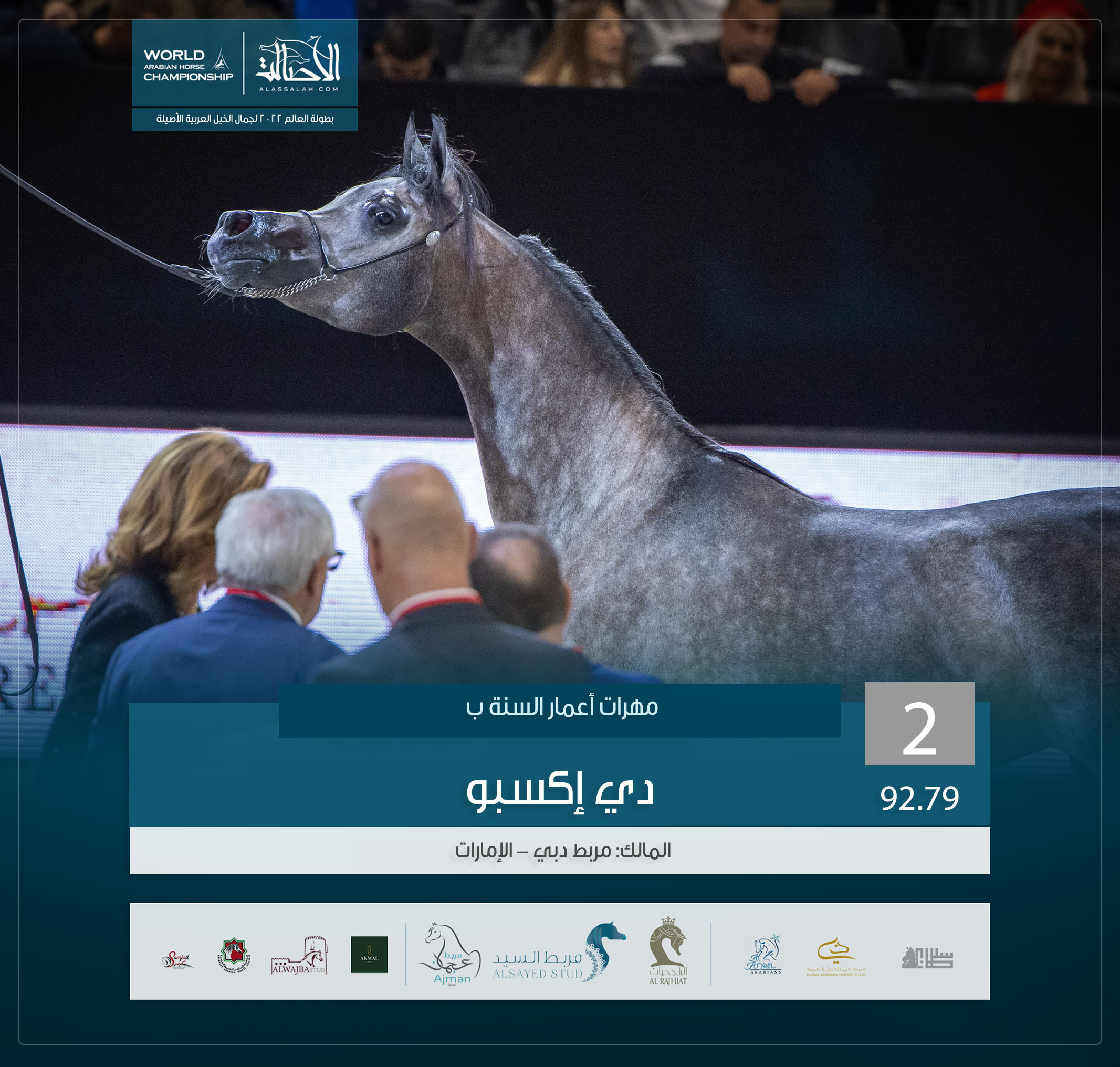 المركز الأول: دي بيسان (دي سراج x ار ايه اتش روزيلا) مربط الشقب – قطر الدرجة: 93.21