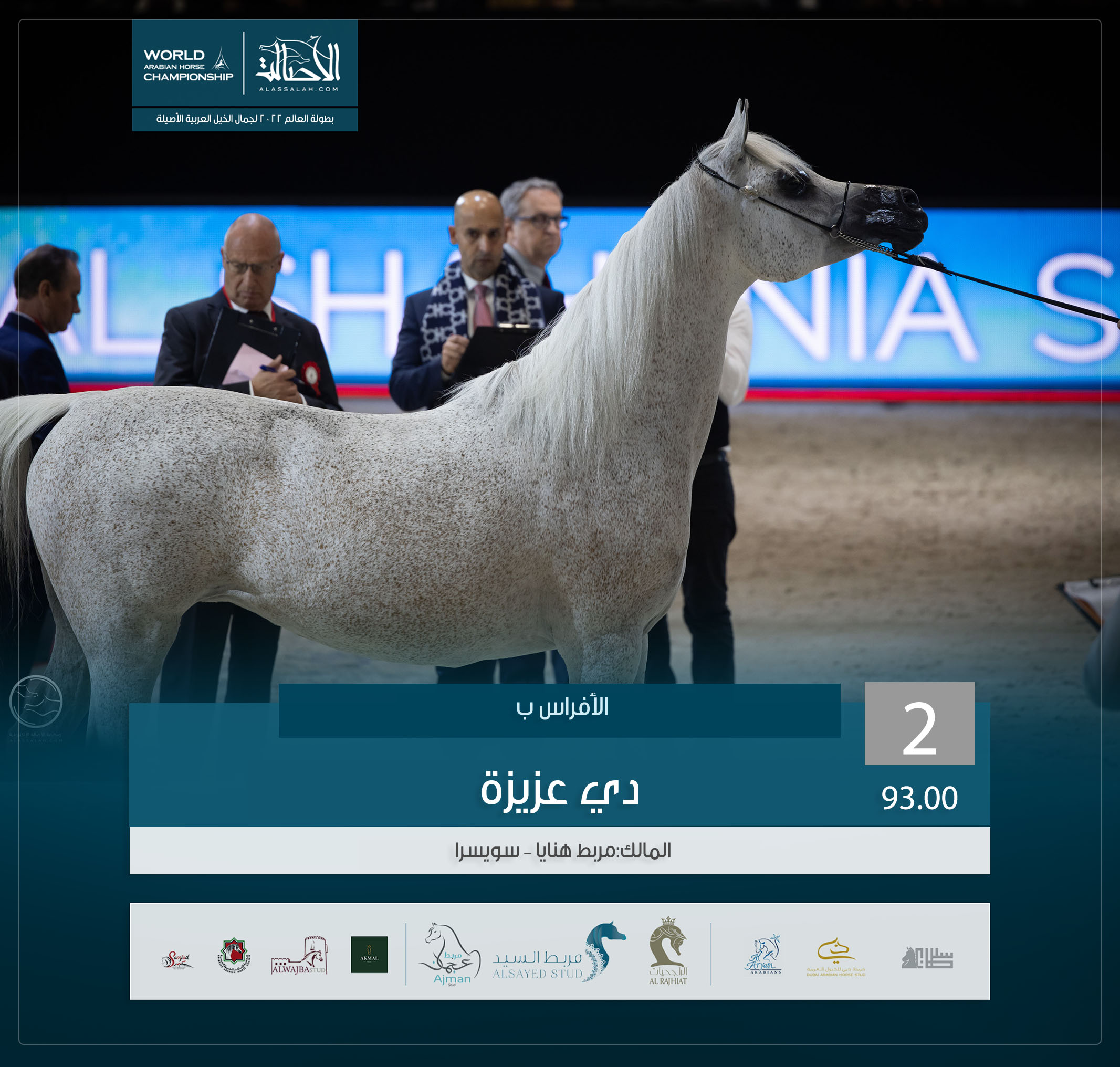 المركز الثاني: دي عزيزة ( عجمان منسيون x ميدنايت كيس جيه) مربط هنايا – سويسرا الدرجة: 93.00