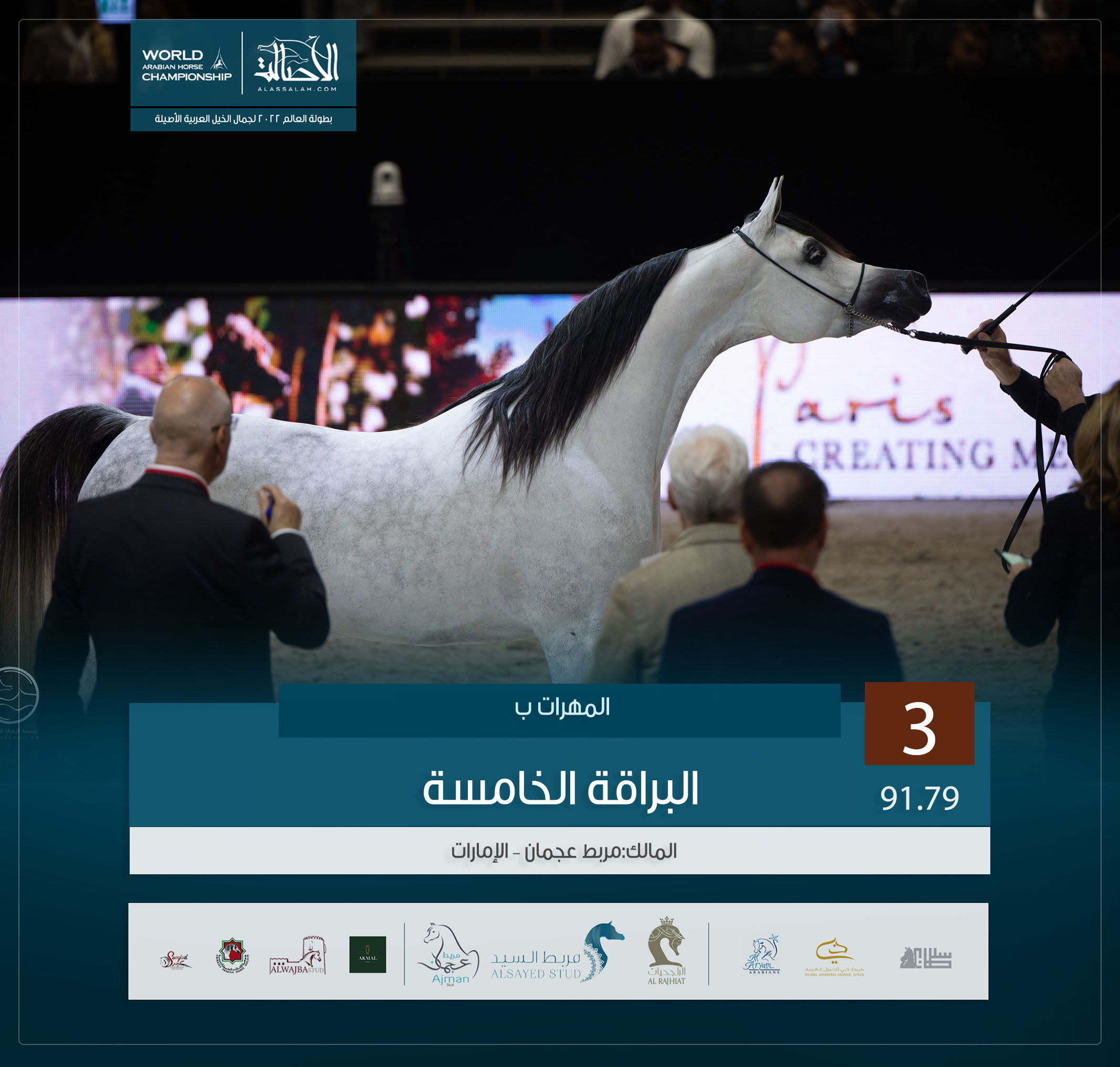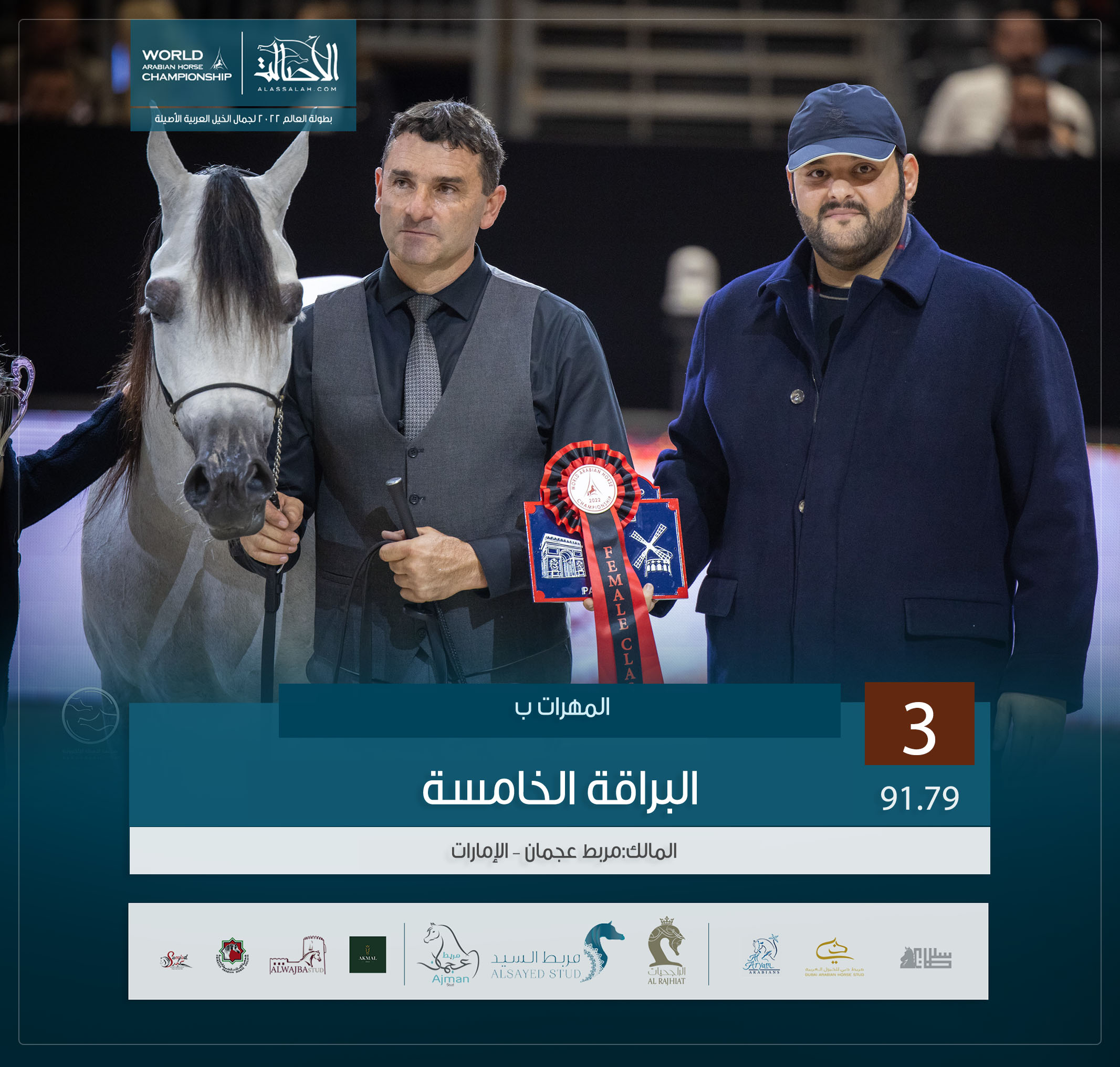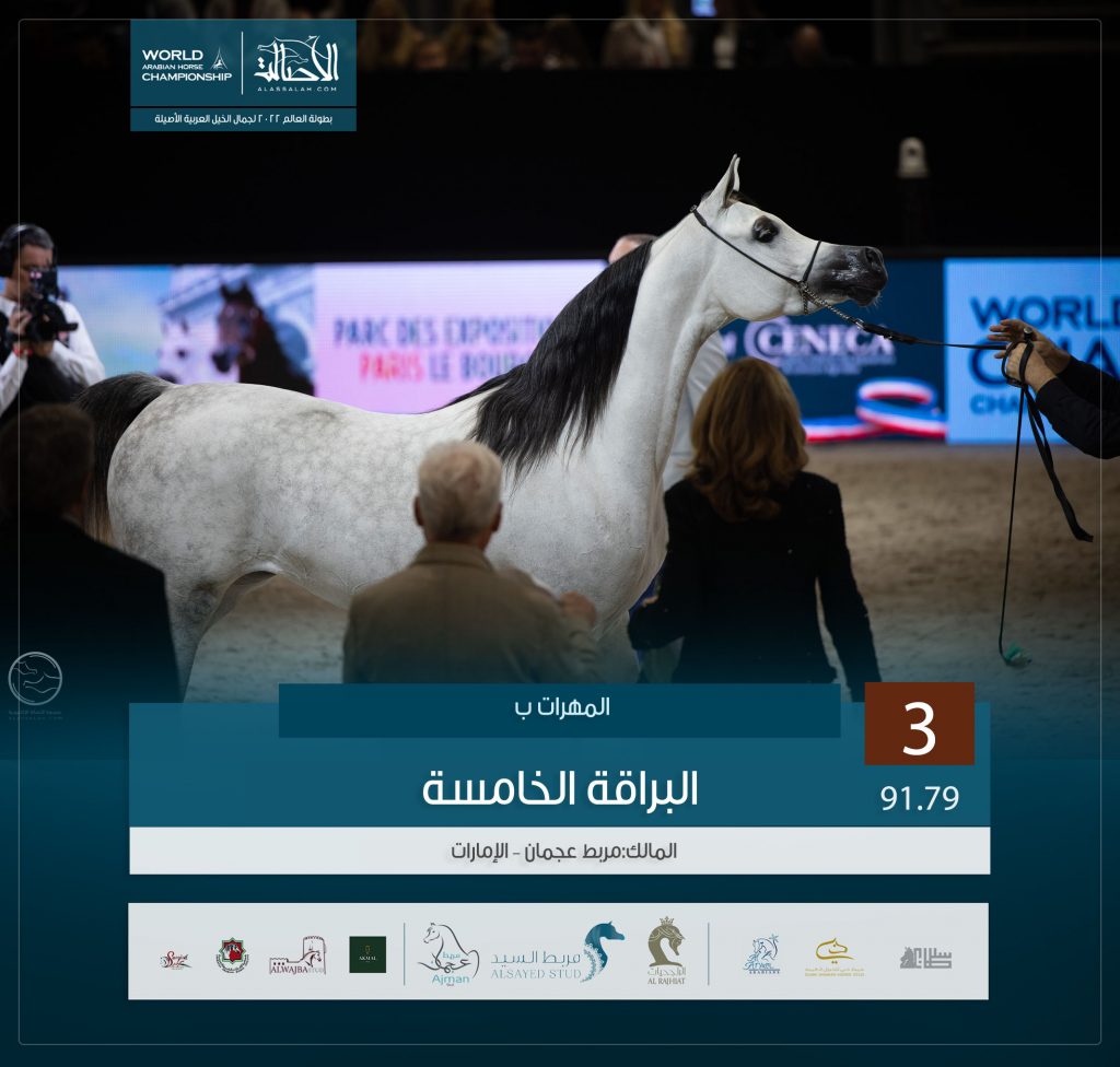 المركز الثالث: البراقة الخامسة (اف ايه الرشيم x فيلينسيا ار ال سي) مربط عجمان – الإمارات الدرجة:91.79