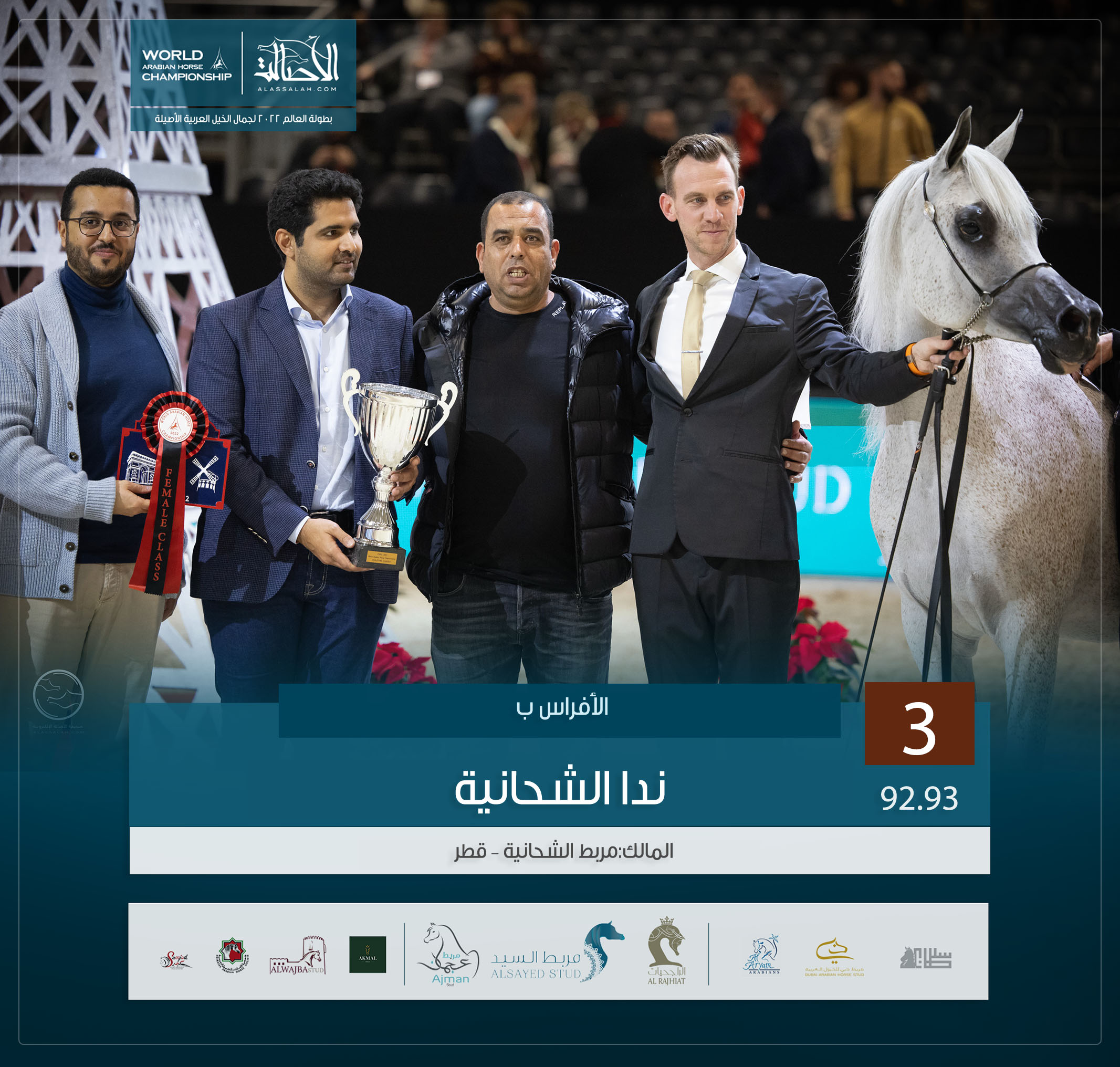 المركز الثالث: ندا الشحانية (بيسون كارول x ام اف ايه انيس سونغ) مربط الشحانية – قطر الدرجة: 92.93
