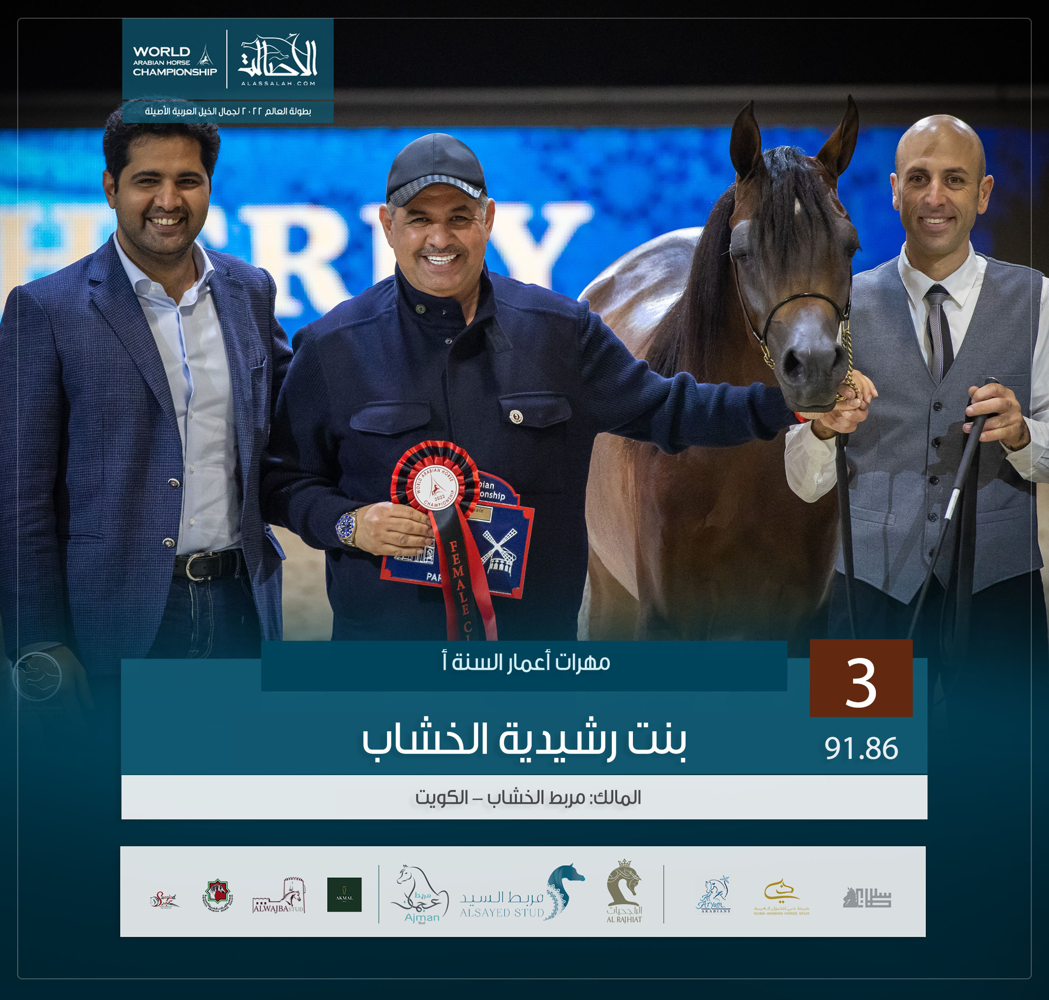 المركز الثالث: بنت رشيدية الخشاب (اي كيه اس فراج x رشيدية الخشاب) مربط الخشاب – الكويت الدرجة: 91.86.