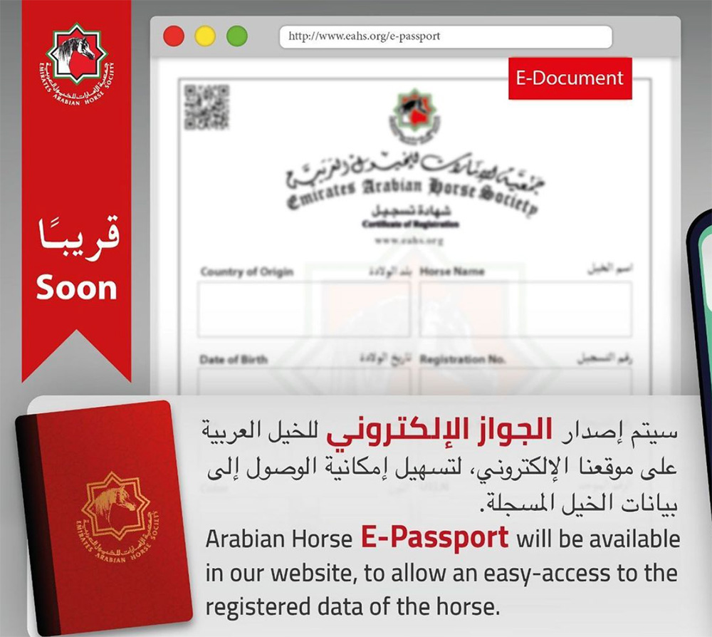 أعلنت جمعية الإمارات للخيول العربية عن تدشين عملية إصدار الجواز الإلكتروني للخيل العربية على موقع الجمعية وذلك بهدف تسهيل الوصول الى البيانات الخاصة بالخيل.