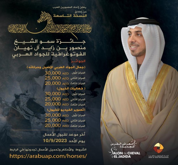 أعلن اتحاد المصورين العرب عن اطلاق النسخة التاسعة من جائزة سمو الشيخ منصور بن زايد ال نهيان الفوتوغرافية للجواد العربي والتي تتزامن فعالياتها مع انطلاق الدورة الرابعة عشر من معرض الفرس في مدينة الجديدة المغربية للفترة من 17 لغاية 22/اكتوبر-2023 تحت الرعاية السامية لصاحب الجلالة الملك محمد السادس نصره الله .