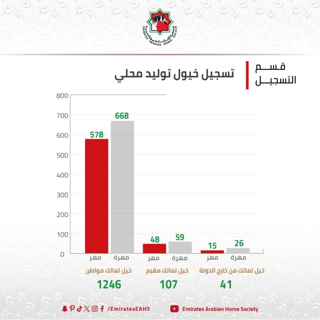 أظهر التقرير تسجيل 1246 خيلًا من الإنتاج المحلي لملاك مواطنين، و107 خيول لملاك مقيمين، و41 خيلًا لملاك من خارج الدولة، مما يعكس الاهتمام المتزايد بتربية الخيول العربية في الإمارات.
