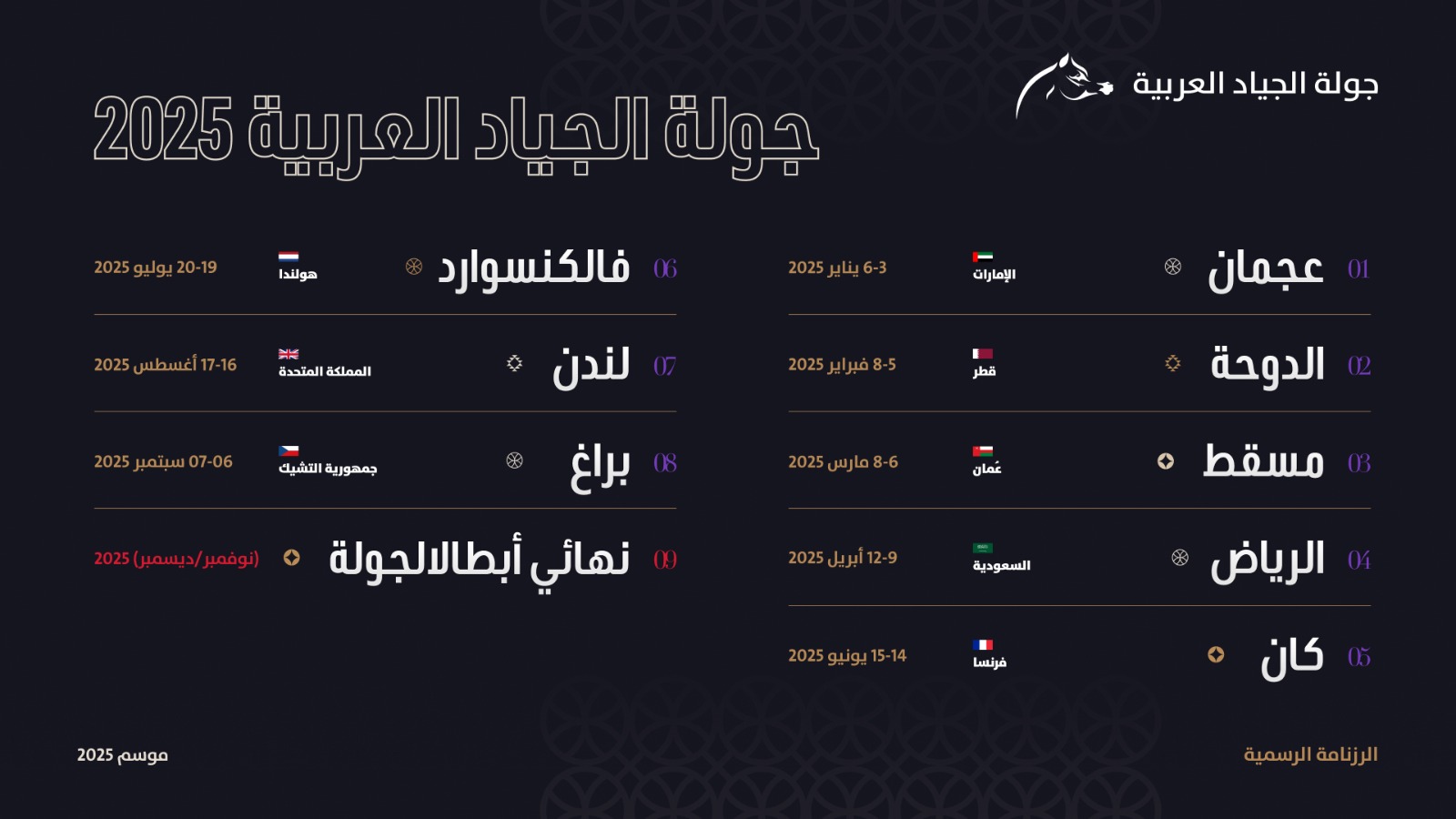 سوف تجمع الجولة خلال 2025 أروع الجياد العربية في العالم وعشّاق هذه الجياد الفريدة معاً. وستحطّ ’جولة الجياد العربية‘ رحالها مجدَّداً في الشرق الأوسط وأوروبا عبر رزنامة متنوّعة جداً، مما يسلّط الضوء على الجمالية الفريدة والإرث العريق الذي تتميّز به الجياد العربية، بينما توفر منصّة تنافسية عالمية المستوى لجميع المشارِكين.
