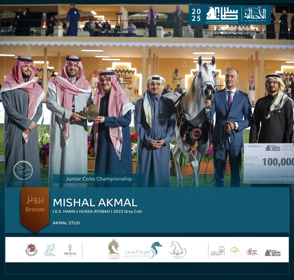 أحرز المهر الواعد مشعل أكمل، المملوك لمربط أكمل، برونزية الأمهار خلال عروض الخيل العربية الأصيلة ضمن مهرجان الأمير سلطان بن عبدالعزيز العالمي للجواد العربي (تايتل شو) 2025، الذي اختتم فعالياته مساء السبت 25 يناير 2025 في مركز الملك عبدالعزيز للخيل العربية.