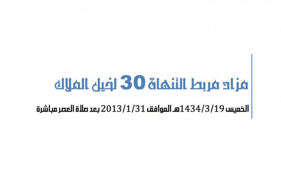 يسر اللجنة المنظمة لمزاد التنهاة للخيل العربية ان يعلن عن إقامة مزاده الثلاثون لخيل الملاك والذي سيقام يوم الخميس المقبل ٢٠١٣/١/٣١ م ١٤٣٤/٣/١٩ هـ بعد صلاة العصر مباشرة في الجنادرية مربط التهاة وفيما يلي قائمة الخيل المعروضة: