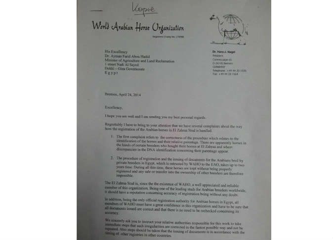 وكان الوزير قد تلقى خطابا من الدكتور هانز ناجل رئيس المنظمة العالمية للحصان العربي “الواهو” يؤكد فيه تلقى شكاوى بشأن الطريقة المتبعة لتسجيل الخيول العربية في مربط الزهراء.