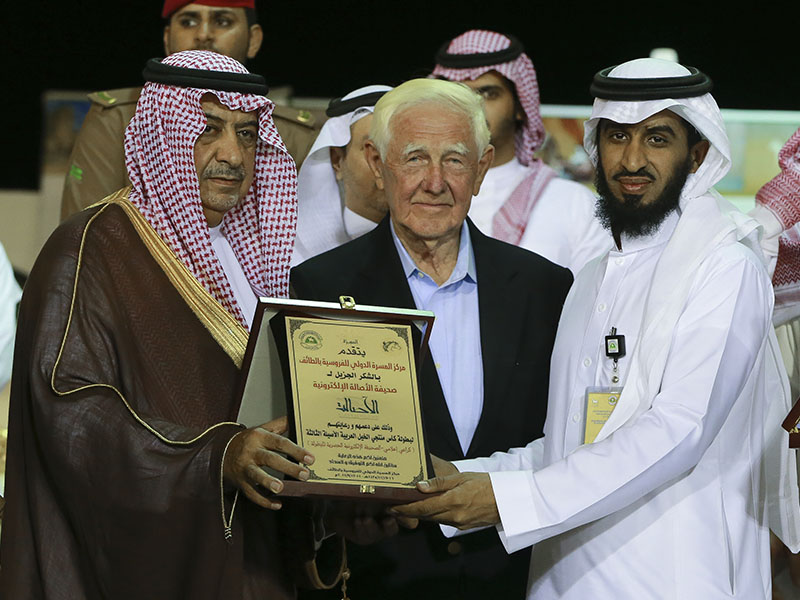 هذا التكريم، جاء على أرض الطائف، برائحة الورد، وطعم العسل، ومذاق الرمان، بين أحضان الطبيعة الخلابة والمناخ المعتدل؛ عندما كرم معالي محافظ محافظة الطائف فهد بن عبدالعزيز بن معمر ، صحيفة “الأصالة” ممثلة بالأستاذ سلطان السويلم مؤسس ومدير عام الصحيفة، وبحضور الدكتور ناجل رئيس المنظمة الدولية للخيل العربية الأصيلة (واهو)، لجهود الصحيفة في خدمة الخيل العربية الاصيلة ، ورعايتها اعلاميا لبطولة منتجي الخيل العربية الثالثة ٢٠١٤م التي اقيمت بمركز المسرة الدولي للفروسية.