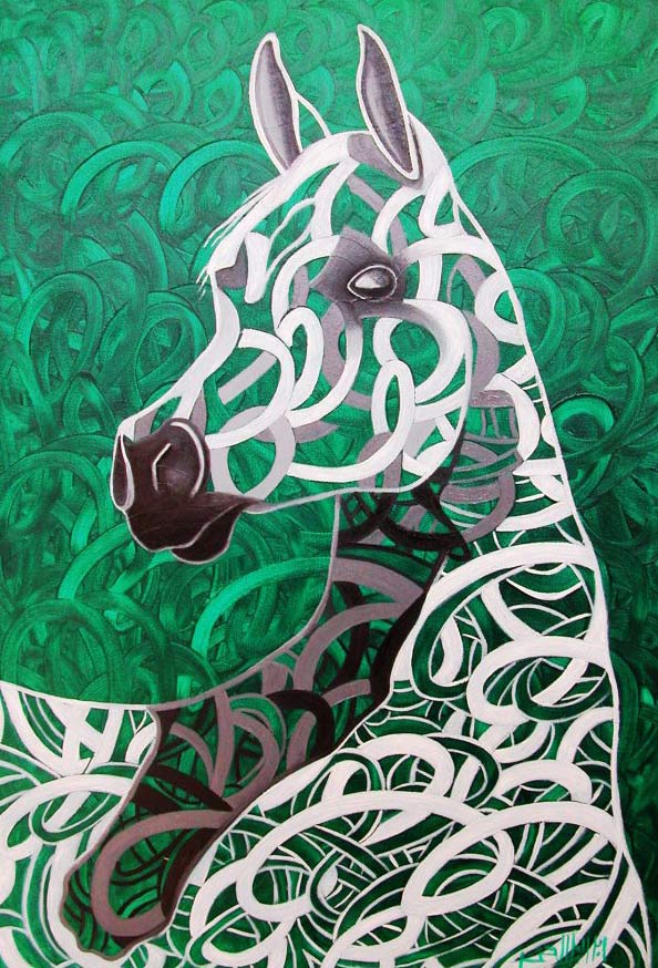 ويضيف:” في 55 لوحة فنية , كل لوحة تحكي شموخ وعزة وتحاكي أحساس الخيل وكبريائه , في فلسفة لونية أعطت الكثير والكثير , للمتلقي البصري البسيط وعشاق الخيل ونقلتهم إلى عالم الخيل من خلال خطوط تشرح الخيل والألوان التي أعطت إيقاع متناغم جعل المتلقي البصري يستحضر في خياله ووجدانه وكأنه يشاهد الخيل في مضمار سباق أو ساحة استعراضية لجمال الخيل بحركات الخيل وصوت مشي الخيل بإيقاع موسيقي متناغم ربط الواقع والخيال , بكل يسر وسهولة, هكذا ترجمها لنا وأعادنا لاستحضار تاريخ الخيل , من بداية التاريخ حتى عصرنا الحاضر ” .