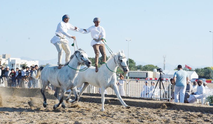 الإثارة والتشويق في الفعالية كانت حاضرة من خلال ركض العرضة ، التي يحرص جميع الفرسان على المشاركة فيها لما لها من أهمية ومكانة خاصة لدى الفرسان المشاركين ؛ كونها تمثل قمة المهارة التي يمتلكها الفارس والتي ينطلق من خلالها فارسان في سباق ثنائي بسرعة فائقة حيث يلتقيان في نقطة معينة بعد الانطلاق ، ويضع كل واحد منهما يده على امتداد كتفي الآخر خلف منطقة العنق ، ويمسكه جيدا بينما يقوم بمسك زمام الفرس باليد الأخرى وهم يظهرون بعض الحركات والمهارات الاستعراضية التي لا تكاد تخلو من المغامرة والمخاطرة ، كالوقوف على ظهر الخيل وهي تعدو حيث يعتبر ركض عرضة الخيل من الفنون التقليدية ، التي يمارسها الفرسان في شتى المناسبات والأعياد المختلفة؛ نظرا لاشتهار السلطنة بها حيث اظهر الفرسان المشاركون مهارات إبداعية نالت دهشة وإعجاب الحضور من خلال الوقوف على ظهر الخيل بكل إتقان وحرفية حتى أن بعض الفرسان العمانيين كانوا يقفون على ظهر الخيل برجل واحدة ، مما عزز ثقتهم بأنفسهم وقدراتهم لتقديم أفضل الاستعراضات ، وان دل هذاعلى شيء فإنما يدل على قدرات الفارس العماني وإمكانياته الكبيرة في التعامل مع الخيل وفنون الفروسية المختلفة.