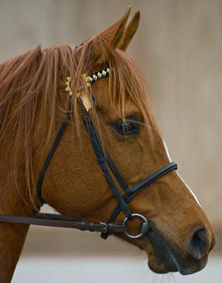 عندما يقوم الحصان بالوخز بأنفه و يصبح فوق مستوى الشكيمة.….. يقوم الجزء الفمي للشكيمة بإحداث ضغط على اللسان، وزوايا الفم، مع ملامسة طفيفة لقضبان الفك.