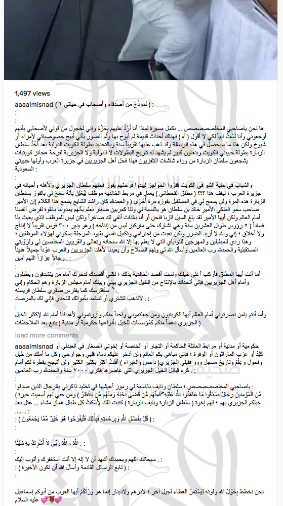 ها نحن ياصاحبي المخلصصصصص … نكمل مسيرة لماذا أنا أَرُدُ عليهم بِحزْم وإني لخجول من قولي لأصحابي بأنهم أوجعوني وأنا لست نبياً لكي لا أقول ( آه ) فهناك أحداث قديمة لم أبوح بها ولَم أتصور بأني أبيح خصوصياتي لأمراء أو شيوخ ولكن هذا ما سيحصل في هذه الرسالة وقد ذهب عليها تقريباً سنة وبالتحديد بطولة الكويت الدولية بعد أَخذ سلطان الزبارة بطولة حبيبتي الكويت وبتعاون كبير لم يشهد له تاريخ البطولات لا الدولية ولا الجزيرية لفرحة عجائز كويتيات يشجعون سلطان الزبارة من وراء شاشات التلفزيون فهذا فحل أهل الجزيريين في جزيرة العرب وأولها حبيبتي السعودية :