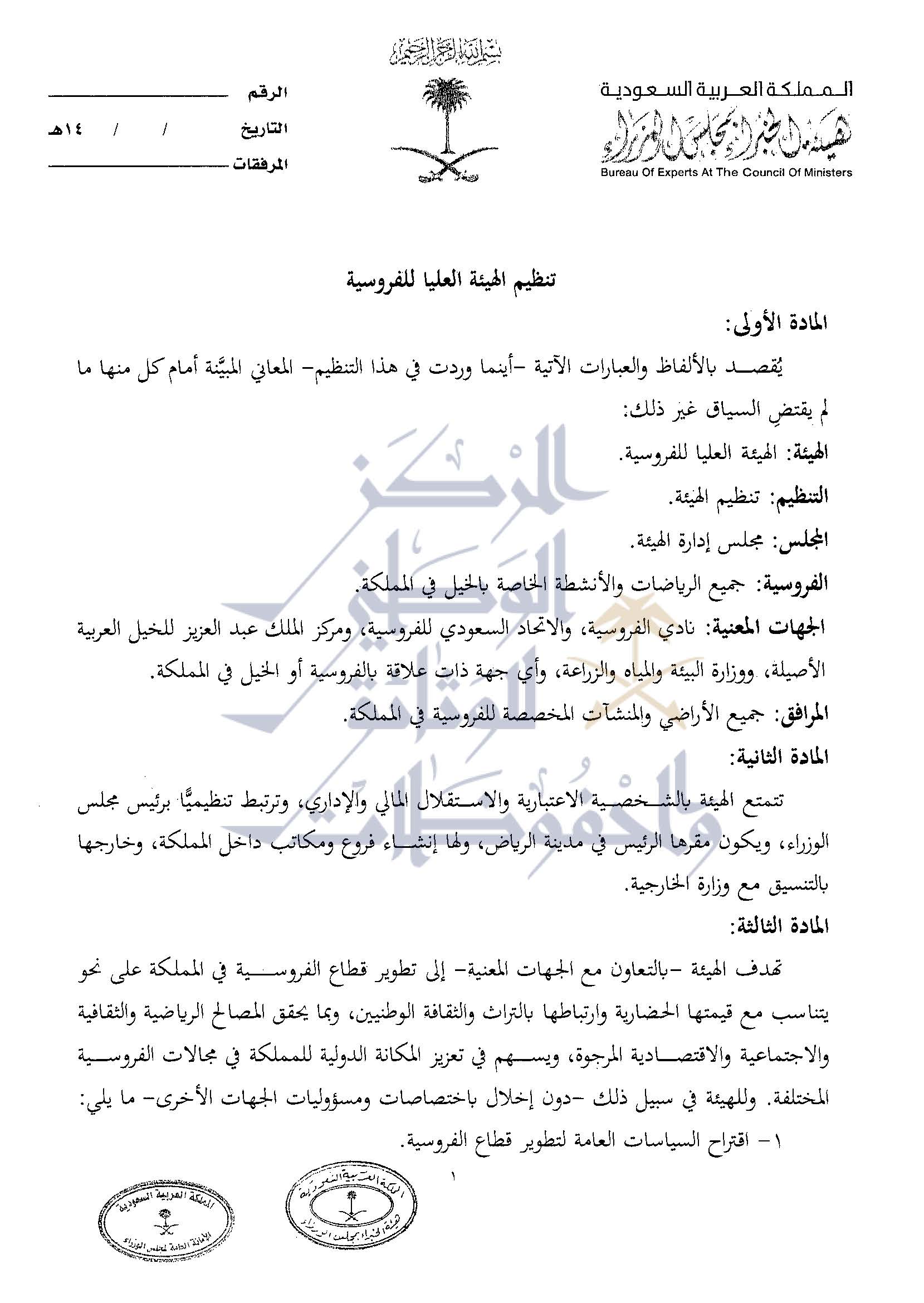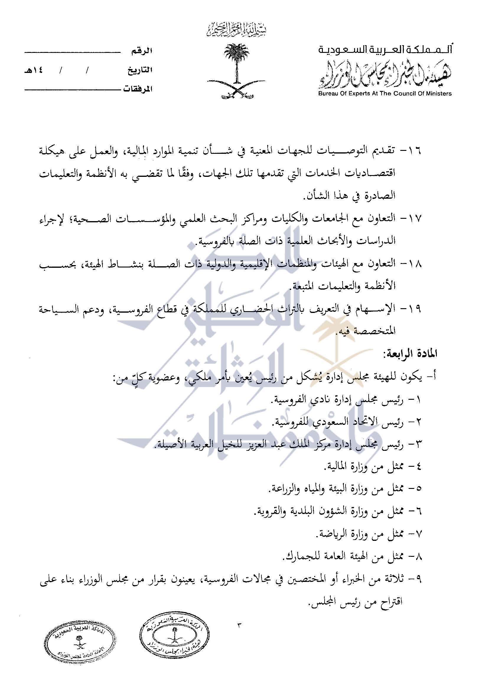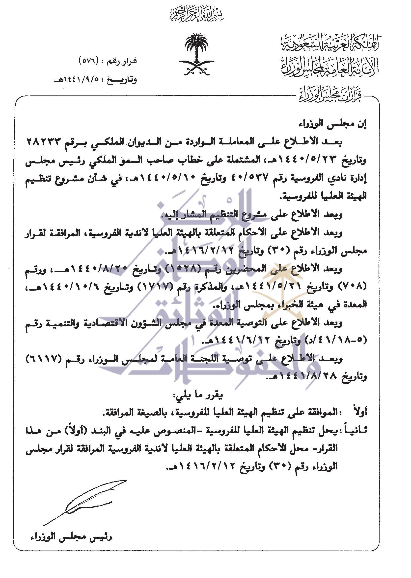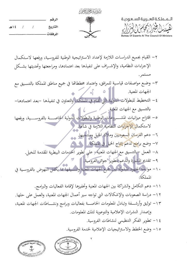 صيغة عمل الهئية العليا للفروسية التي وافق عليها مجلس الوزراء في الجلسة الماضية