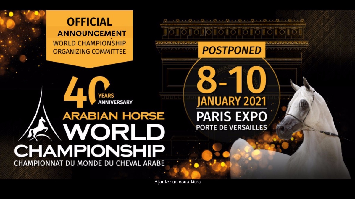 أعلنت اللجنة المنظمة لبطولة العالم لجمال الخيل العربية الأصيلة باريس 2020 تأجيل فعاليات النسخة الـ 40 للبطولة التي كان من المقرر قيامها الرابع من ديسمبر المقبل، الى يوم 8 يناير 2021 المقبل ، وذلك لتداعيات تطور أزمة كورنا ، والإجراءات المتبعة التي تفرضها السلطة في فرنسا.