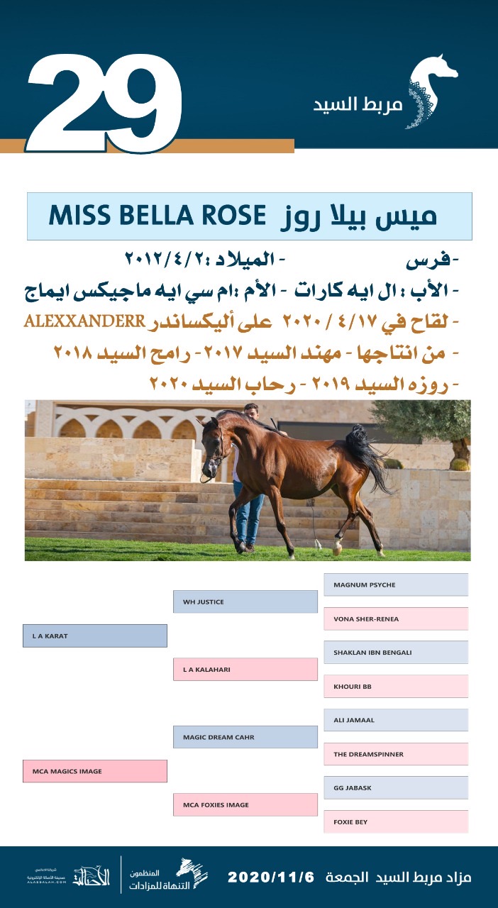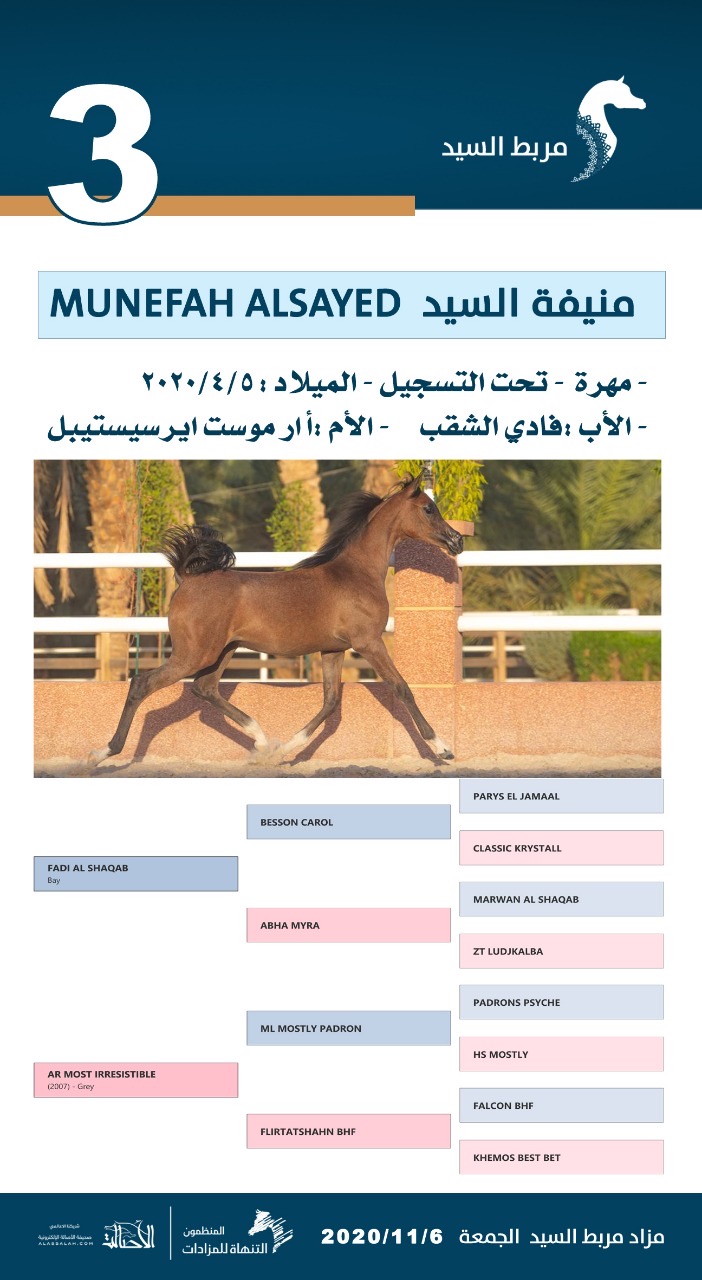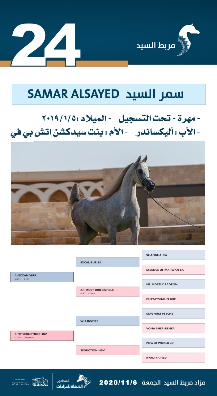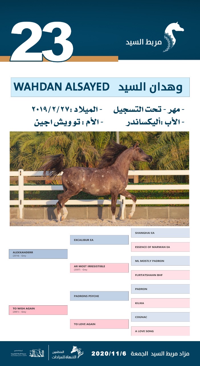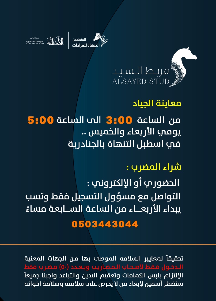 يقيم مربط السيد المملوك لعبد الوهاب وخالد أبناء سعيد السيد، مزاده الخامس لخيول الجمال العربية الأصيلة في الثالثة والنصف من مساء الجمعة المقبل الموافق السادس من نوفمبر 2020 بمربط التنهاة بالجنادرية، بمشاركة 33 جواداً معروضة بسعر السوق.