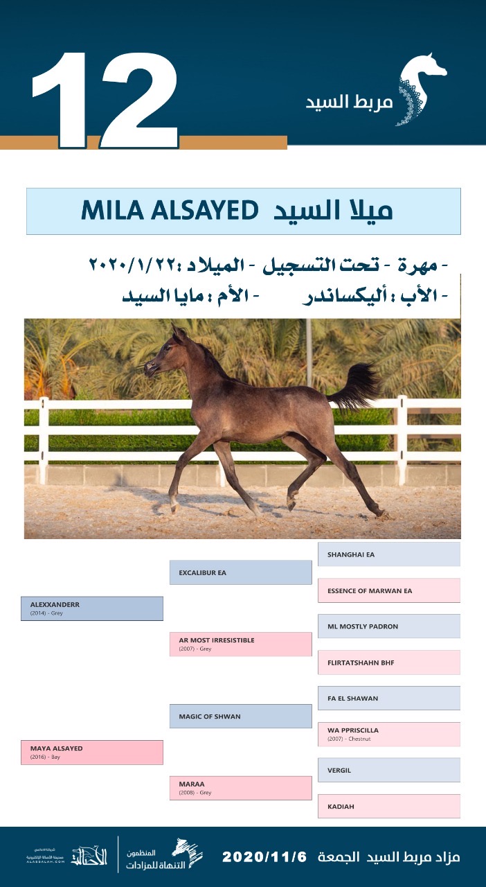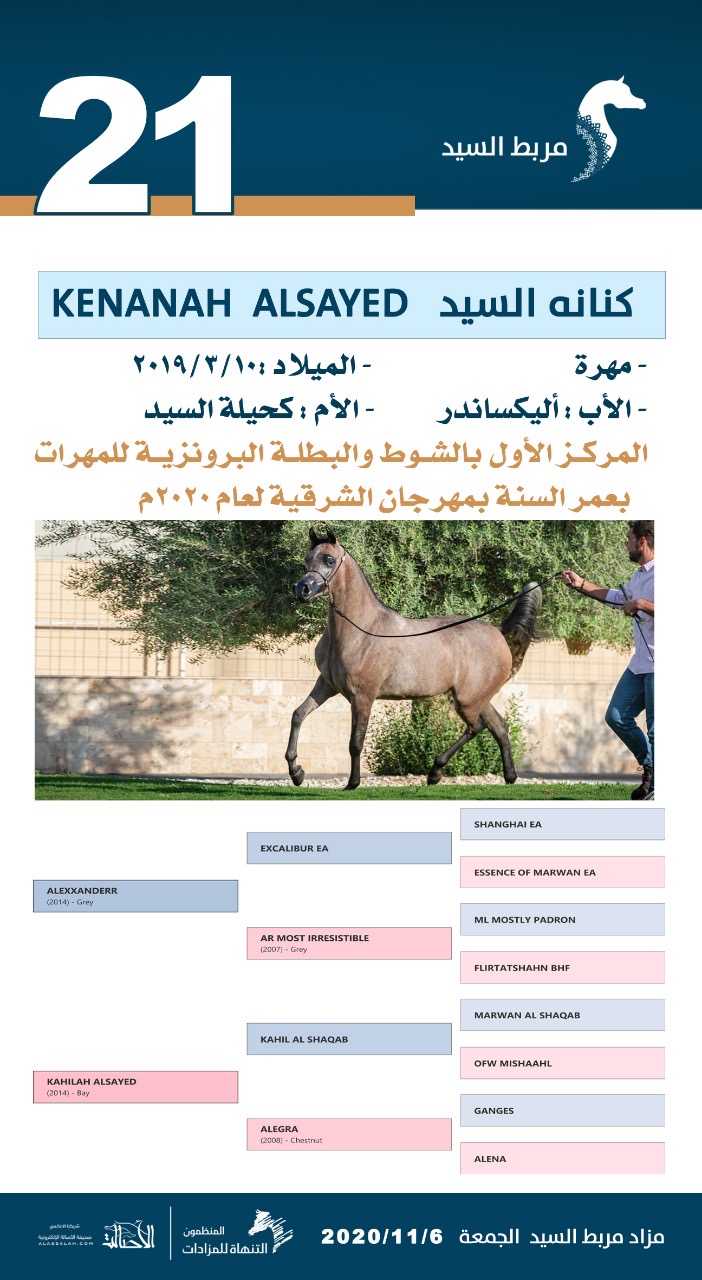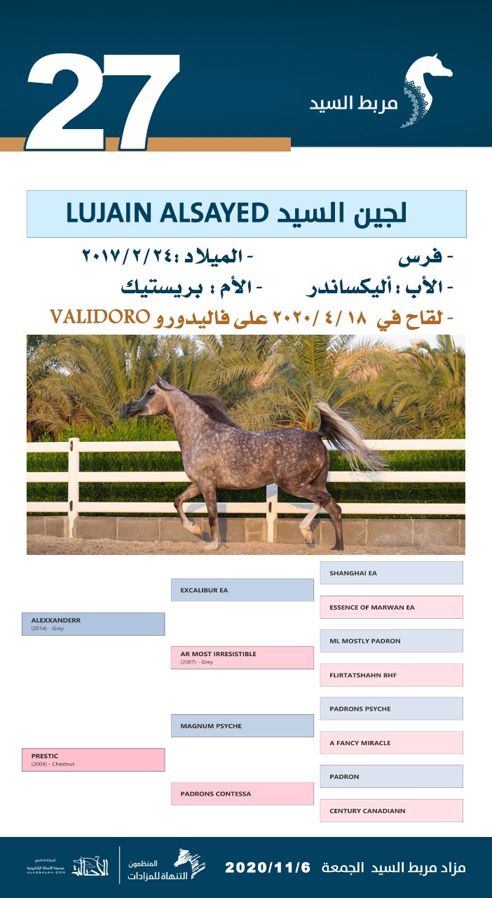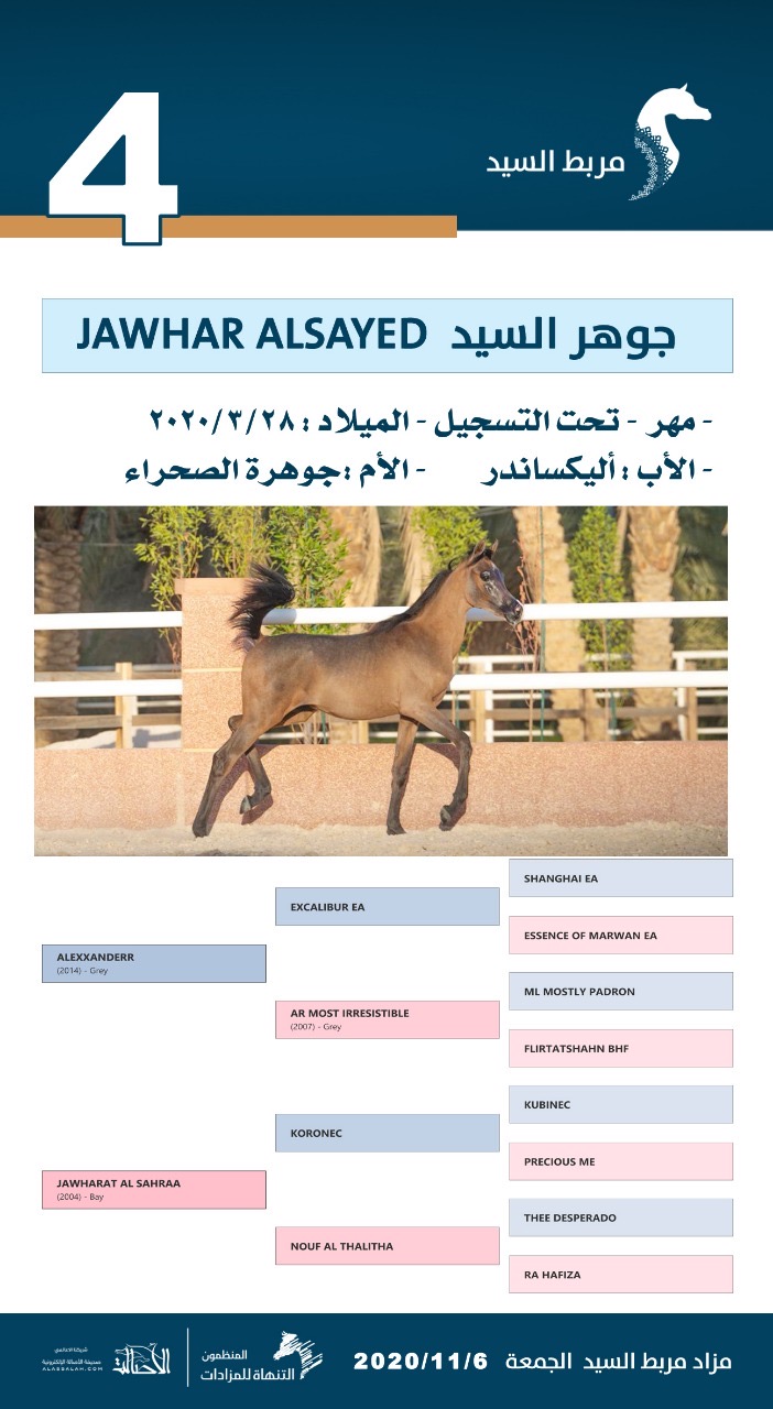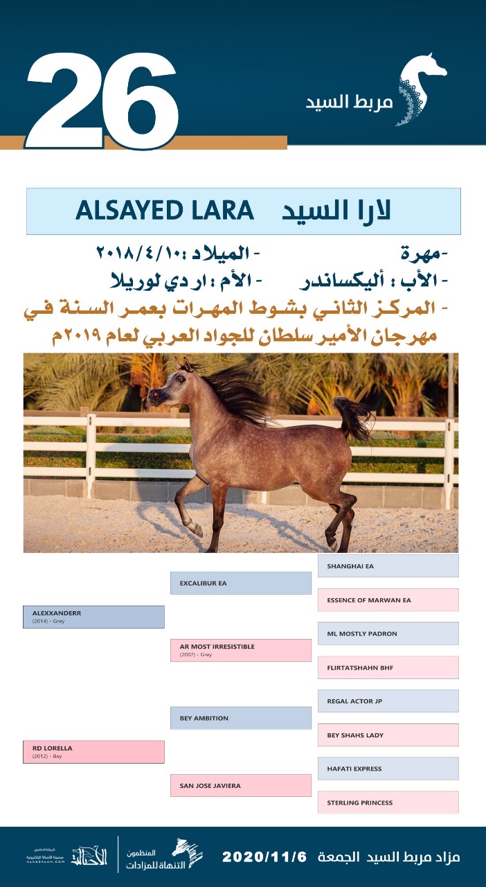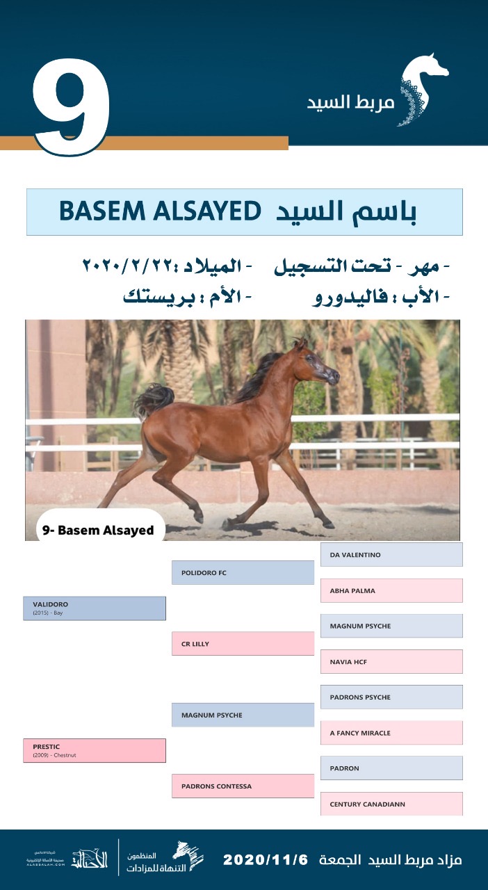 يقيم مربط السيد المملوك لعبد الوهاب وخالد أبناء سعيد السيد، مزاده الخامس لخيول الجمال العربية الأصيلة في الثالثة والنصف من مساء الجمعة المقبل الموافق السادس من نوفمبر 2020 بمربط التنهاة بالجنادرية، بمشاركة 33 جواداً معروضة بسعر السوق.