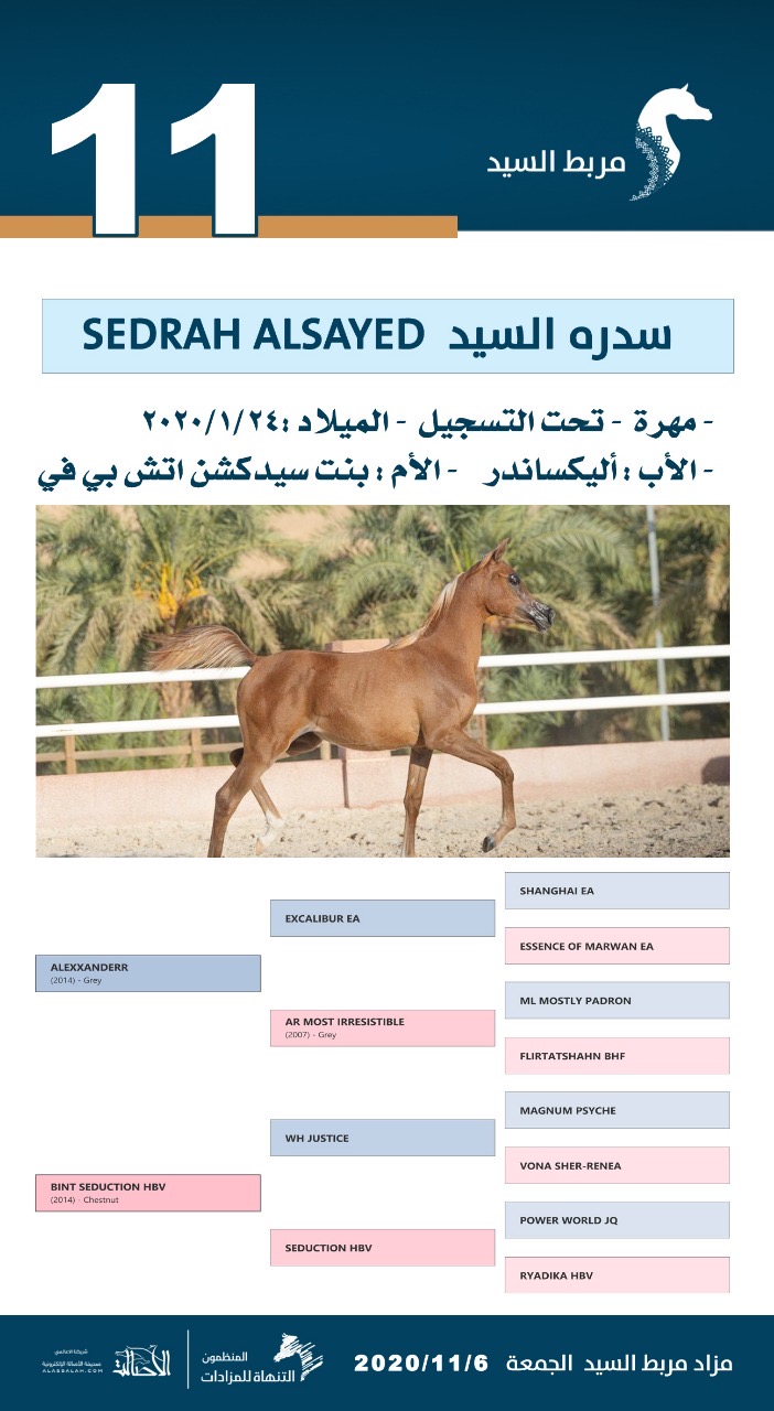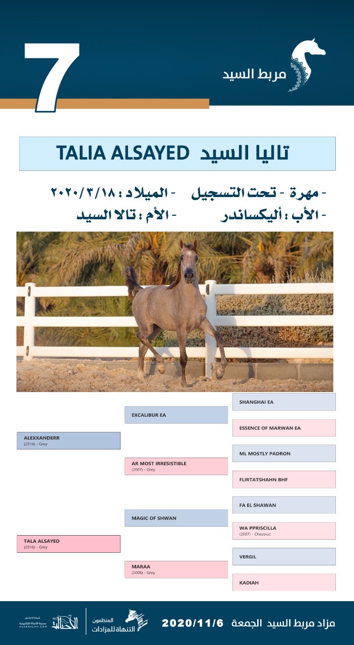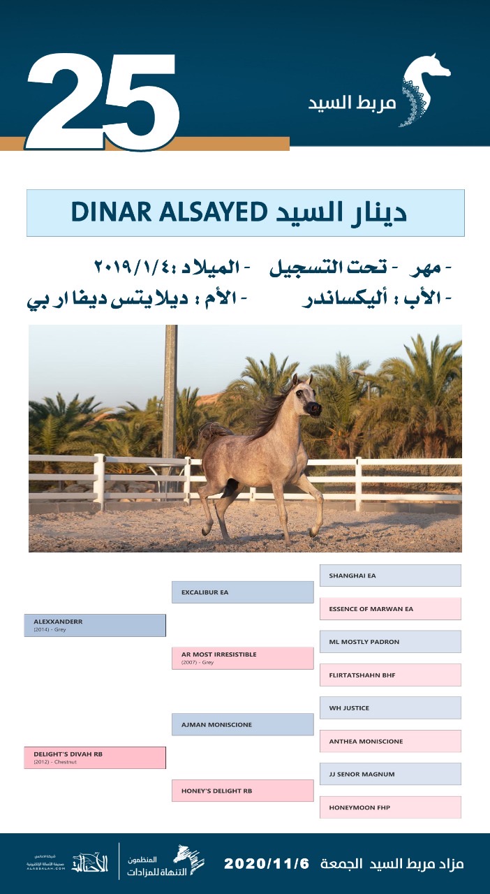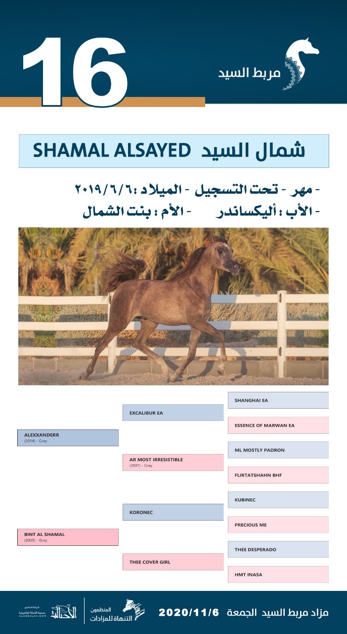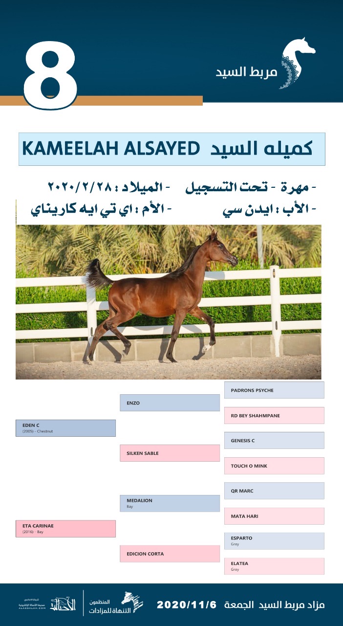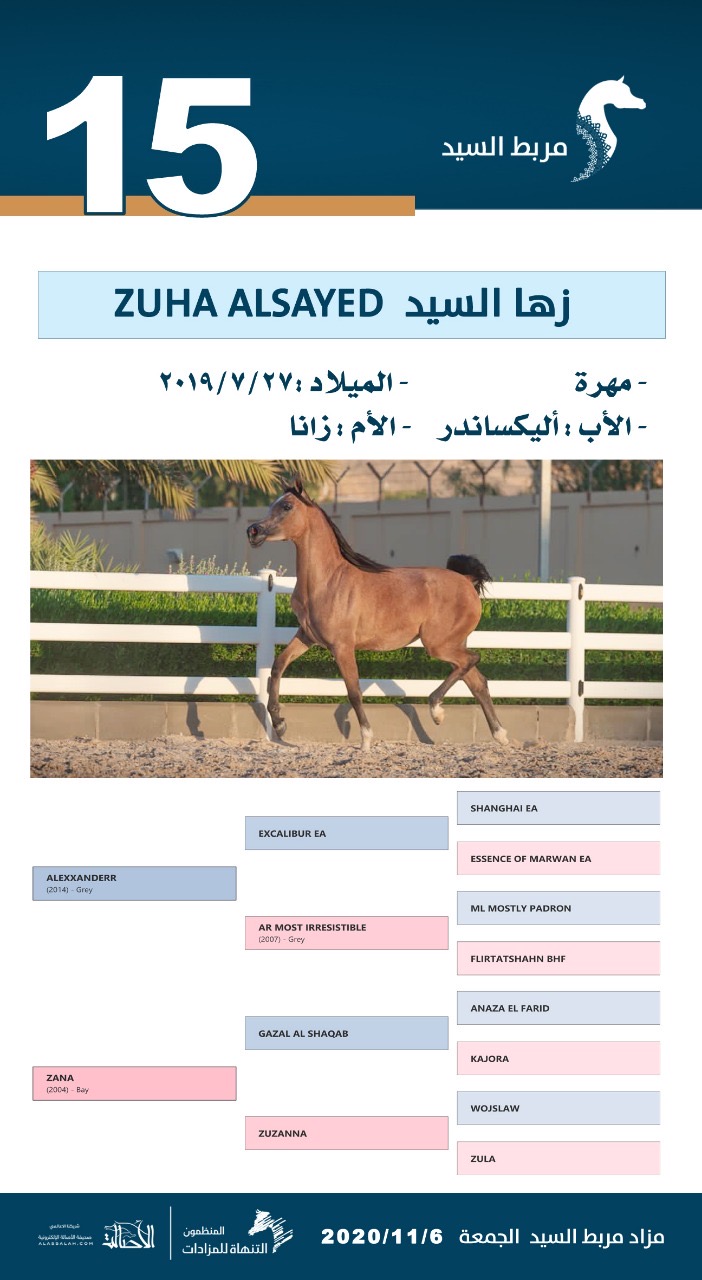 يقيم مربط السيد المملوك لعبد الوهاب وخالد أبناء سعيد السيد، مزاده الخامس لخيول الجمال العربية الأصيلة في الثالثة والنصف من مساء الجمعة المقبل الموافق السادس من نوفمبر 2020 بمربط التنهاة بالجنادرية، بمشاركة 33 جواداً معروضة بسعر السوق.