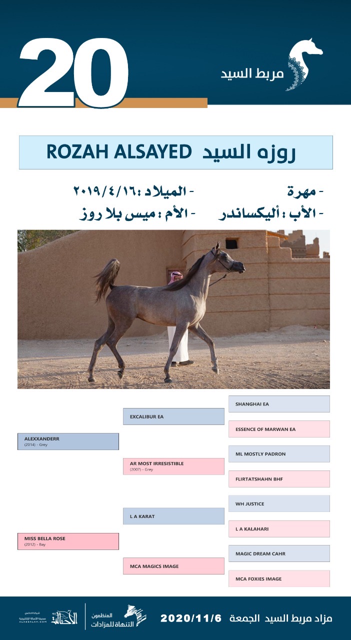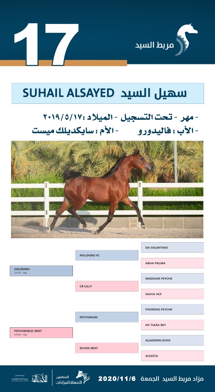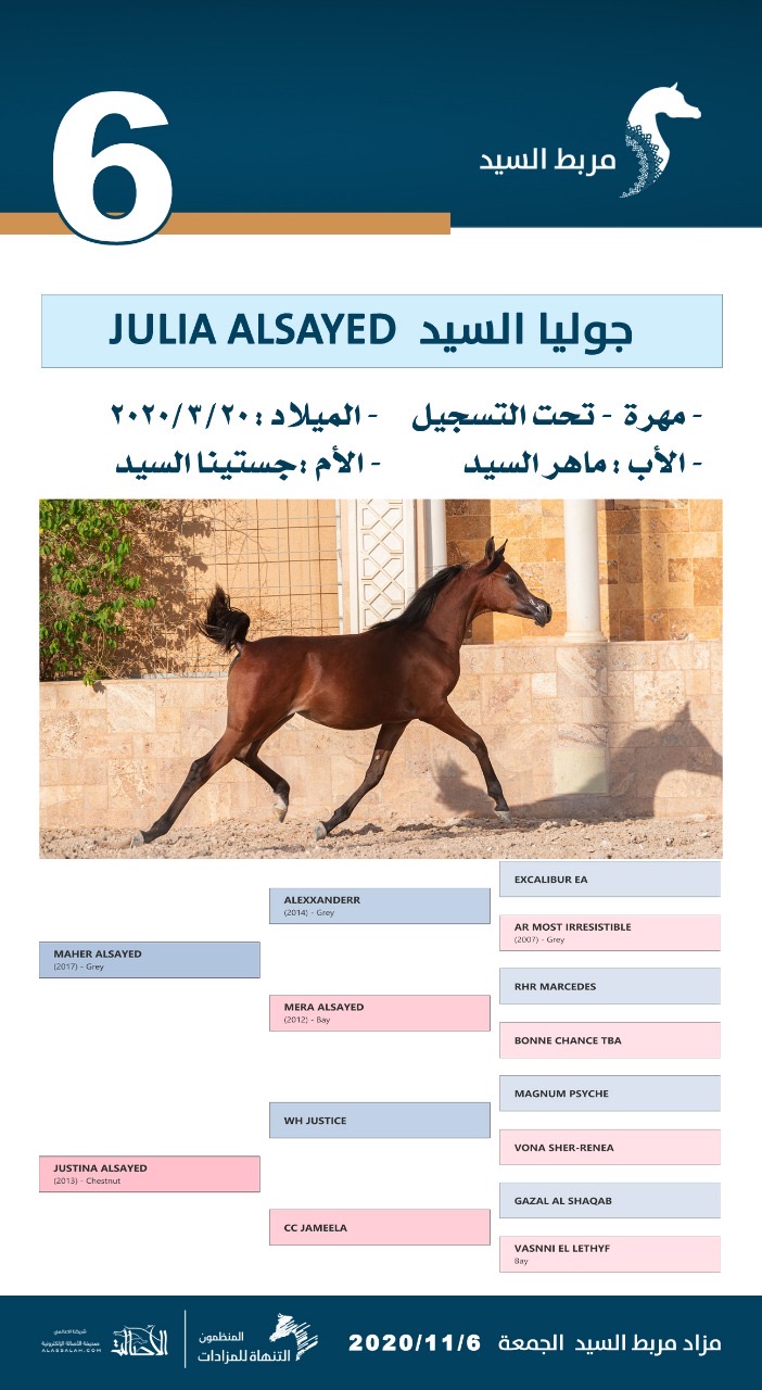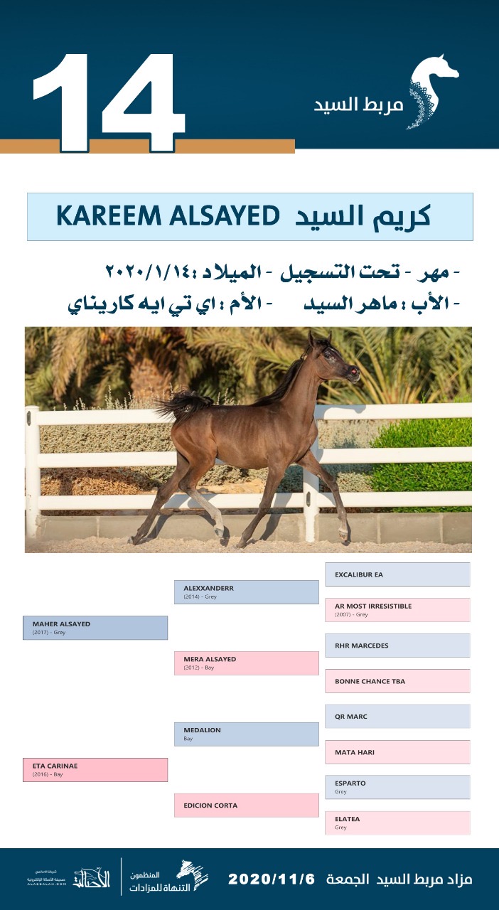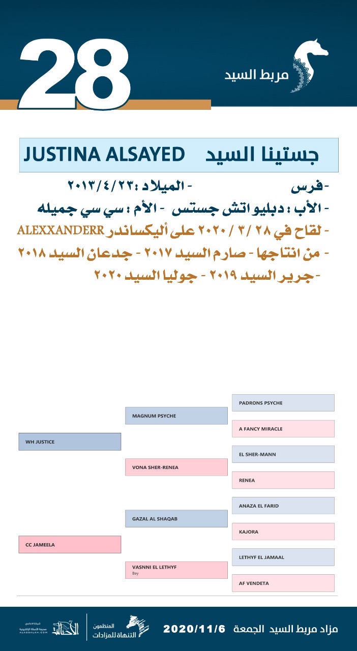 يقيم مربط السيد المملوك لعبد الوهاب وخالد أبناء سعيد السيد، مزاده الخامس لخيول الجمال العربية الأصيلة في الثالثة والنصف من مساء الجمعة المقبل الموافق السادس من نوفمبر 2020 بمربط التنهاة بالجنادرية، بمشاركة 33 جواداً معروضة بسعر السوق.