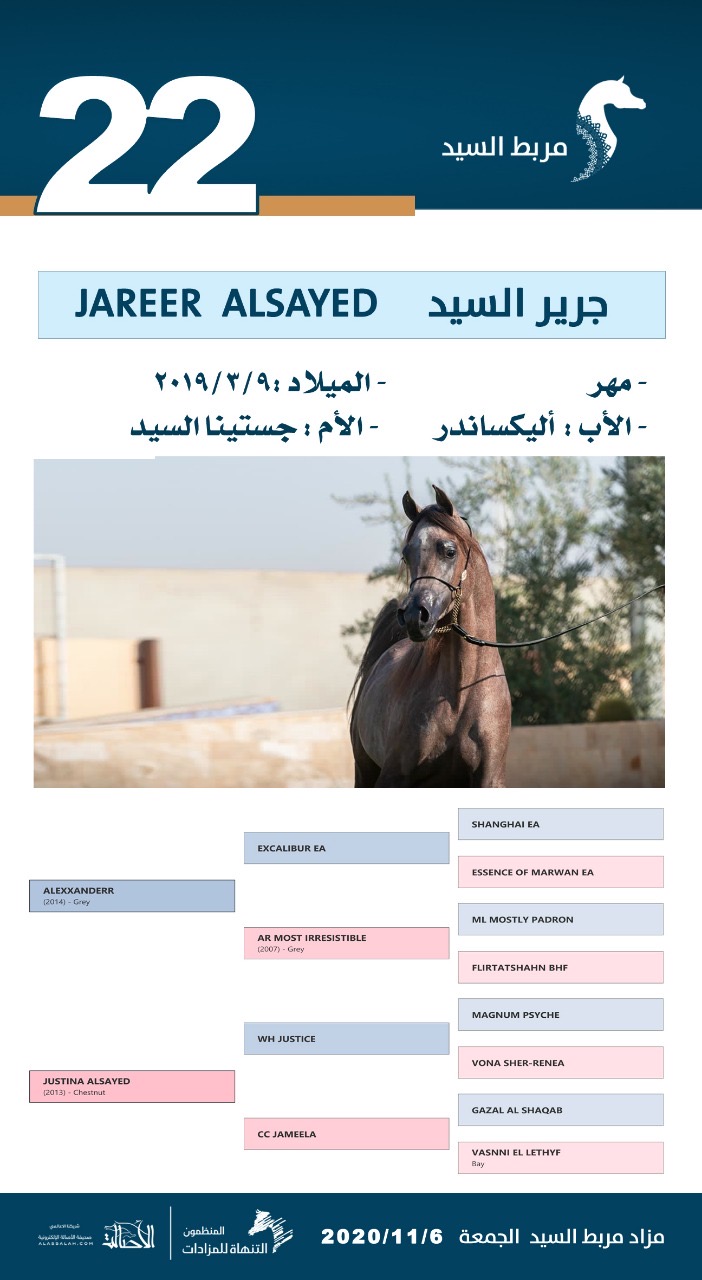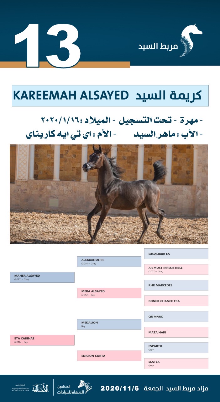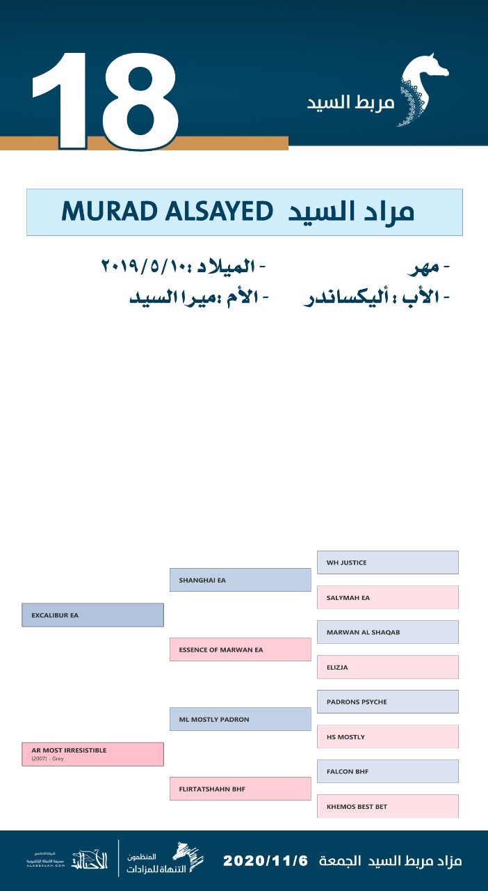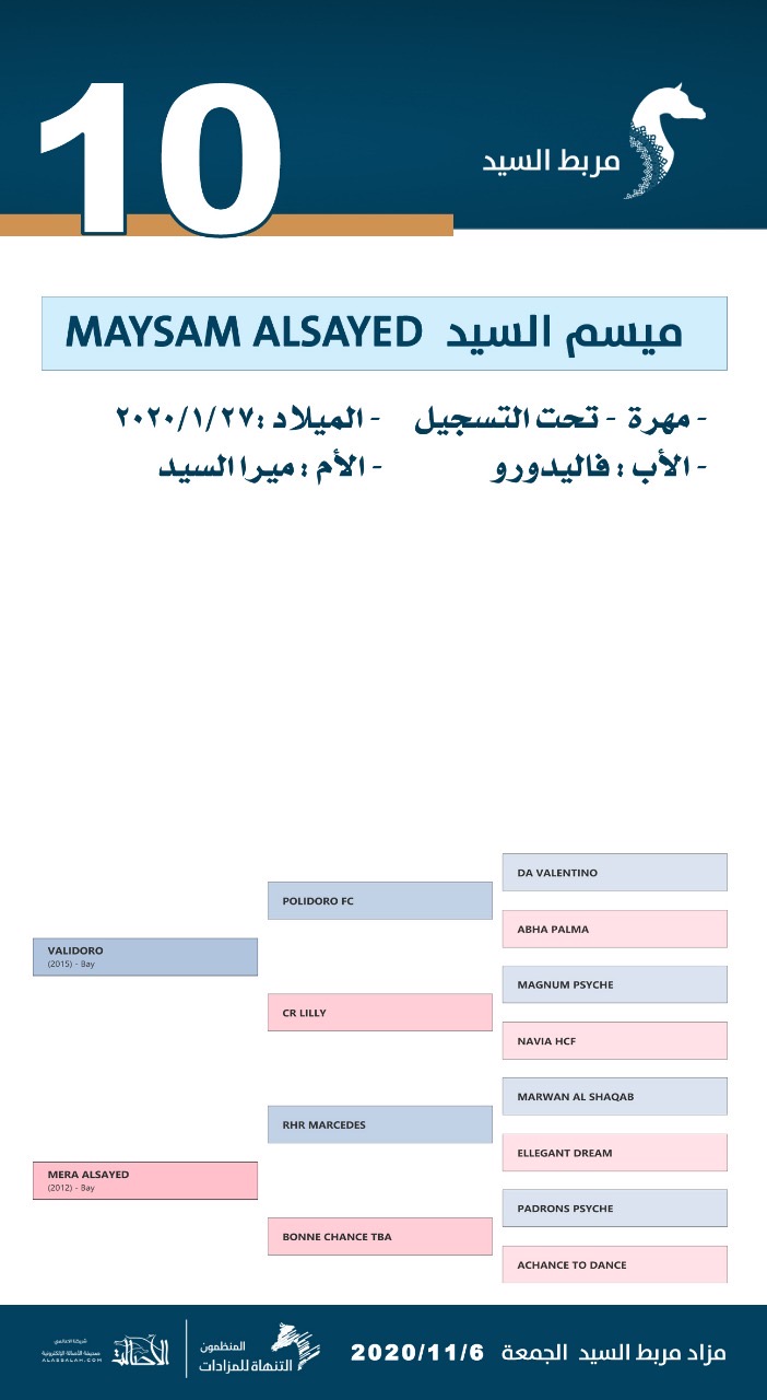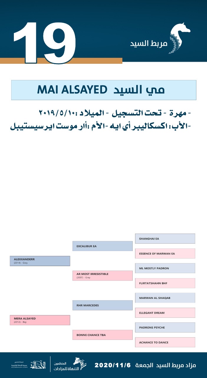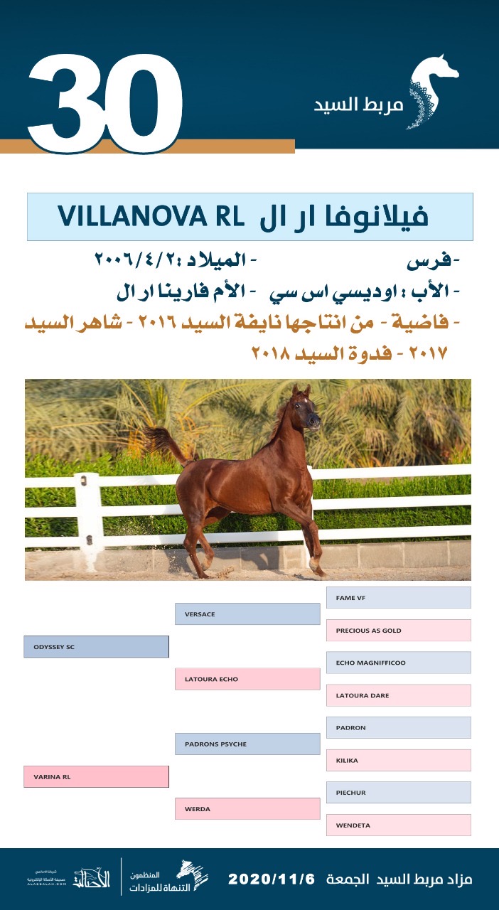 يقيم مربط السيد المملوك لعبد الوهاب وخالد أبناء سعيد السيد، مزاده الخامس لخيول الجمال العربية الأصيلة في الثالثة والنصف من مساء الجمعة المقبل الموافق السادس من نوفمبر 2020 بمربط التنهاة بالجنادرية، بمشاركة 33 جواداً معروضة بسعر السوق.