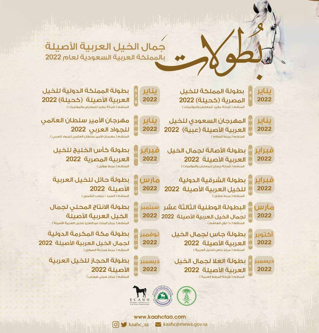 اعلن مركز الملك عبدالعزيز للخيل العربية بديراب برنامج بطولات موسم عروض الجمال في المملكة العربية السعودية 2022، ويحتوي الموسم على 14 بطولة ومنافسة دولية ومحلية من مختلف التصنيفات بدأ من التايتل شو .