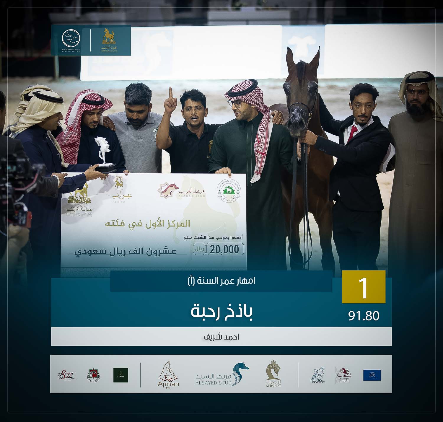 المركز الأول: بازخ رحبة (مهاجر المعود x باهية آر جي) مربط أحمد بن صالح شريف- السعودية.