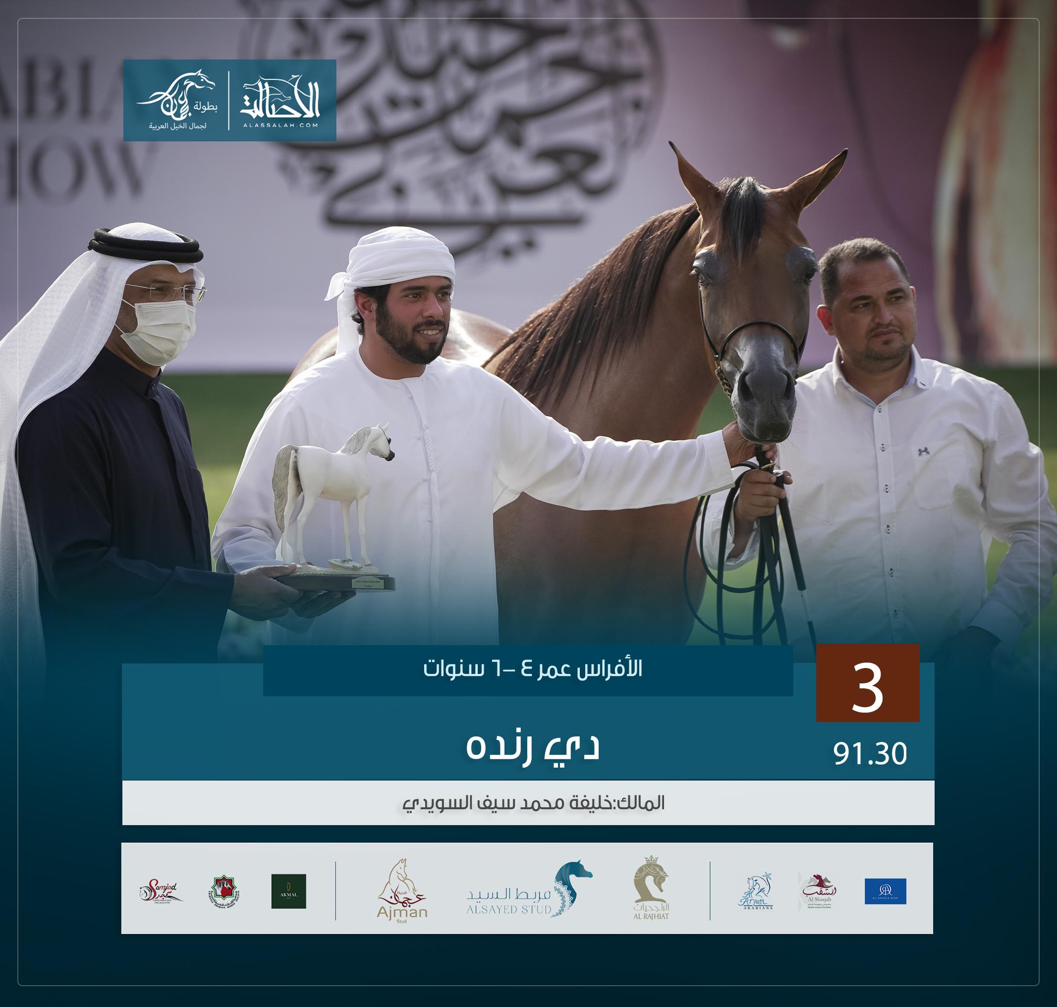 المركز الثالث: دي رنده (اف ايه الرشيم x دي شهيرة) مربط خليفة محمد سيف السويدي. الدرجة:91.30