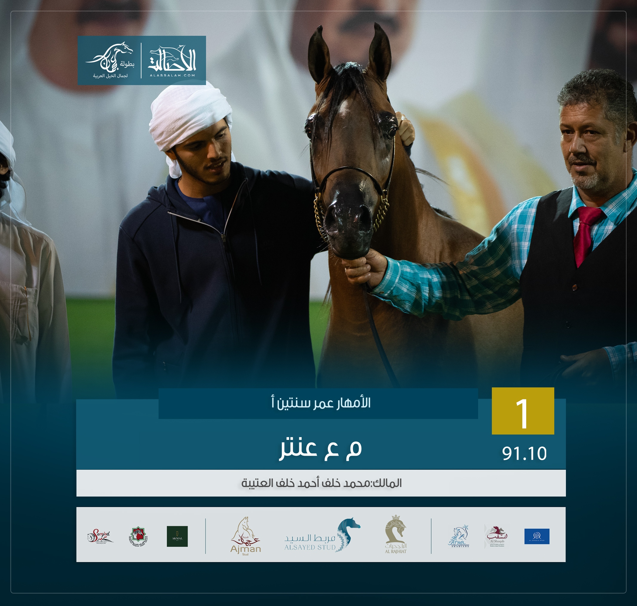 المركز الأول: م ع عنتر (اس كيو شداد x م ع مزيونة) مربط محمد خلف أحمد خلف العتيبة. الدرجة:91.10