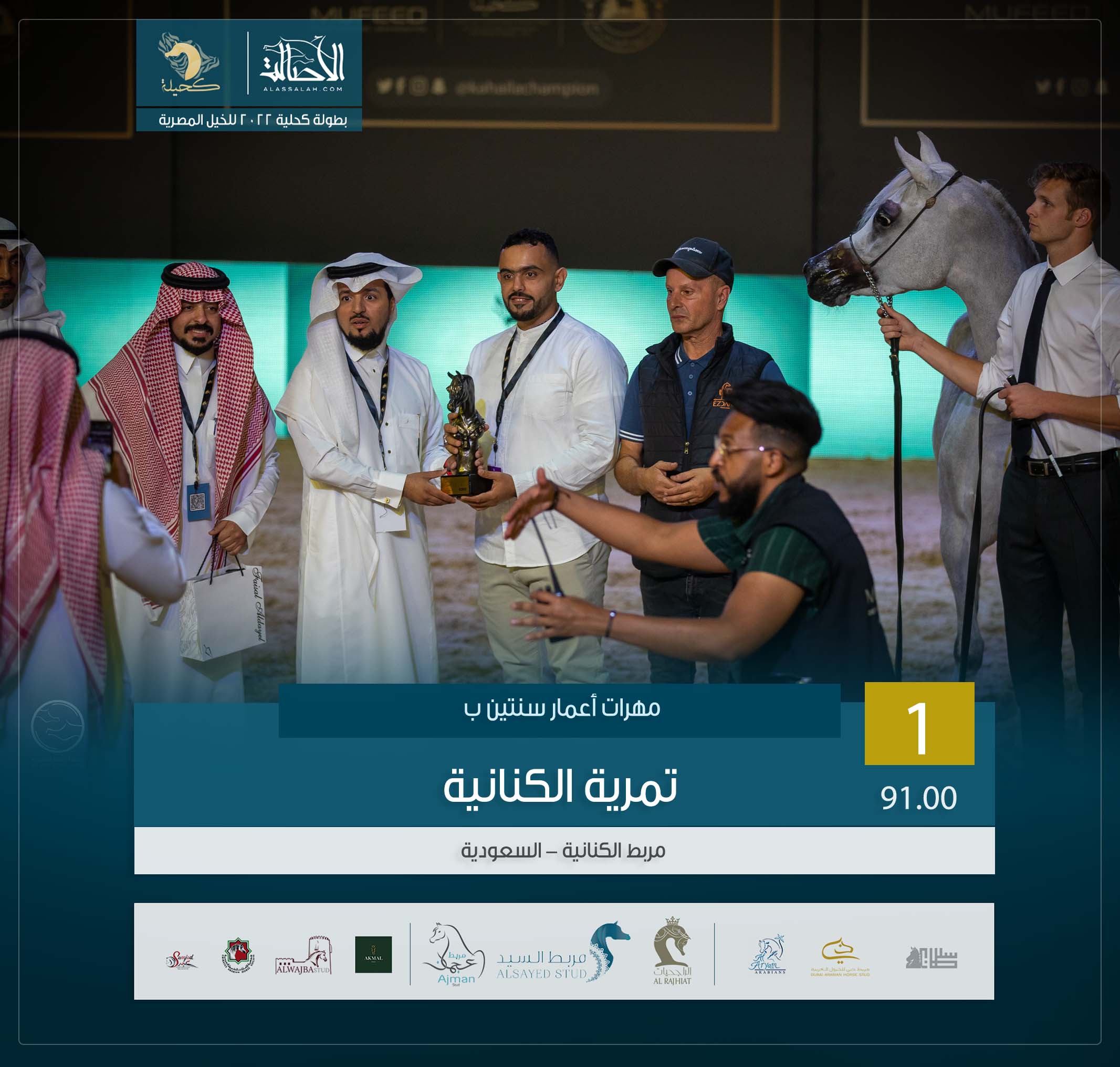 المركز الأول: تمرية الكنانية (هلايل الوعب x الفابيا تامريا) مربط الكنانية- السعودية.