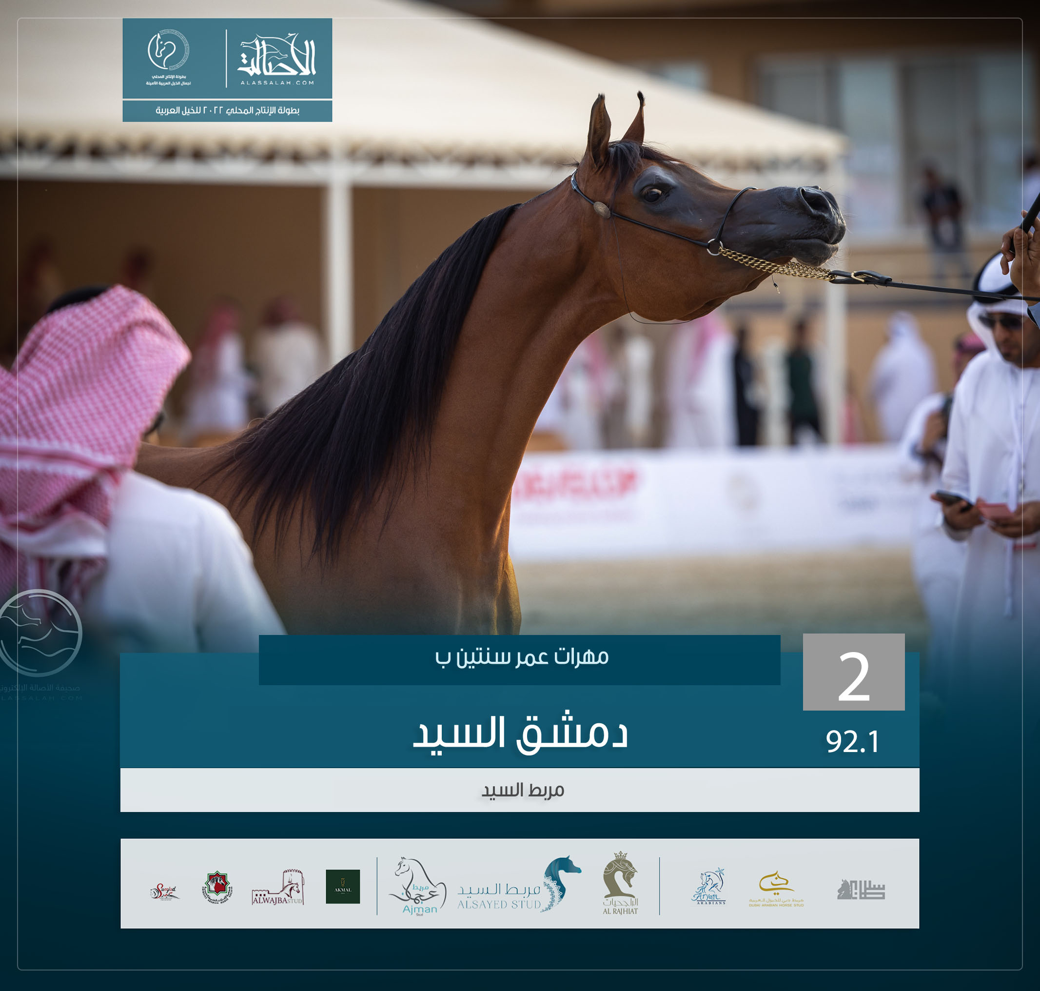 المركز الثاني: دمشق السيد ( فاليدورو x ديلايتس ديفا ار بي) مربط السيد. 92.10 نقطة.