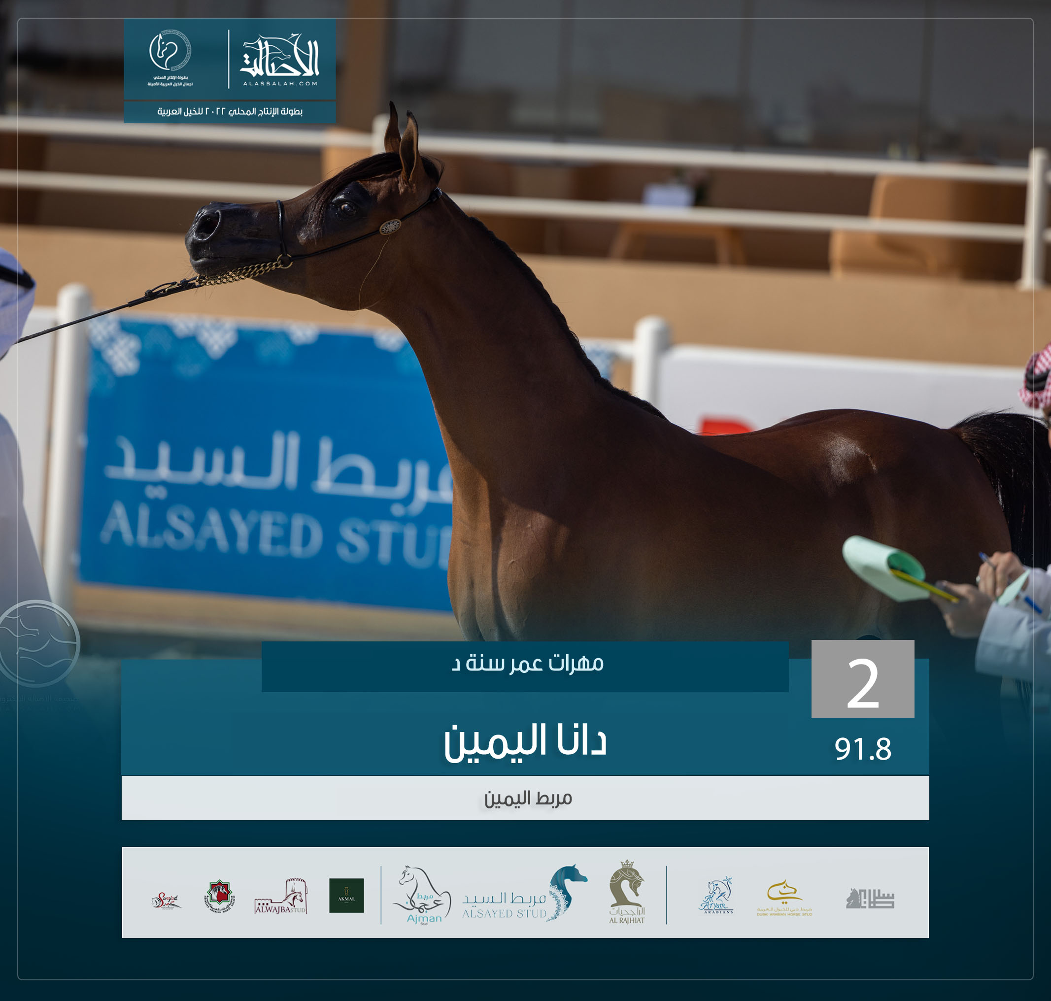المركز الثاني: دانا اليمين (فاليدورو x شموخ العناية) مربط اليمين. 91.80 نقطة.