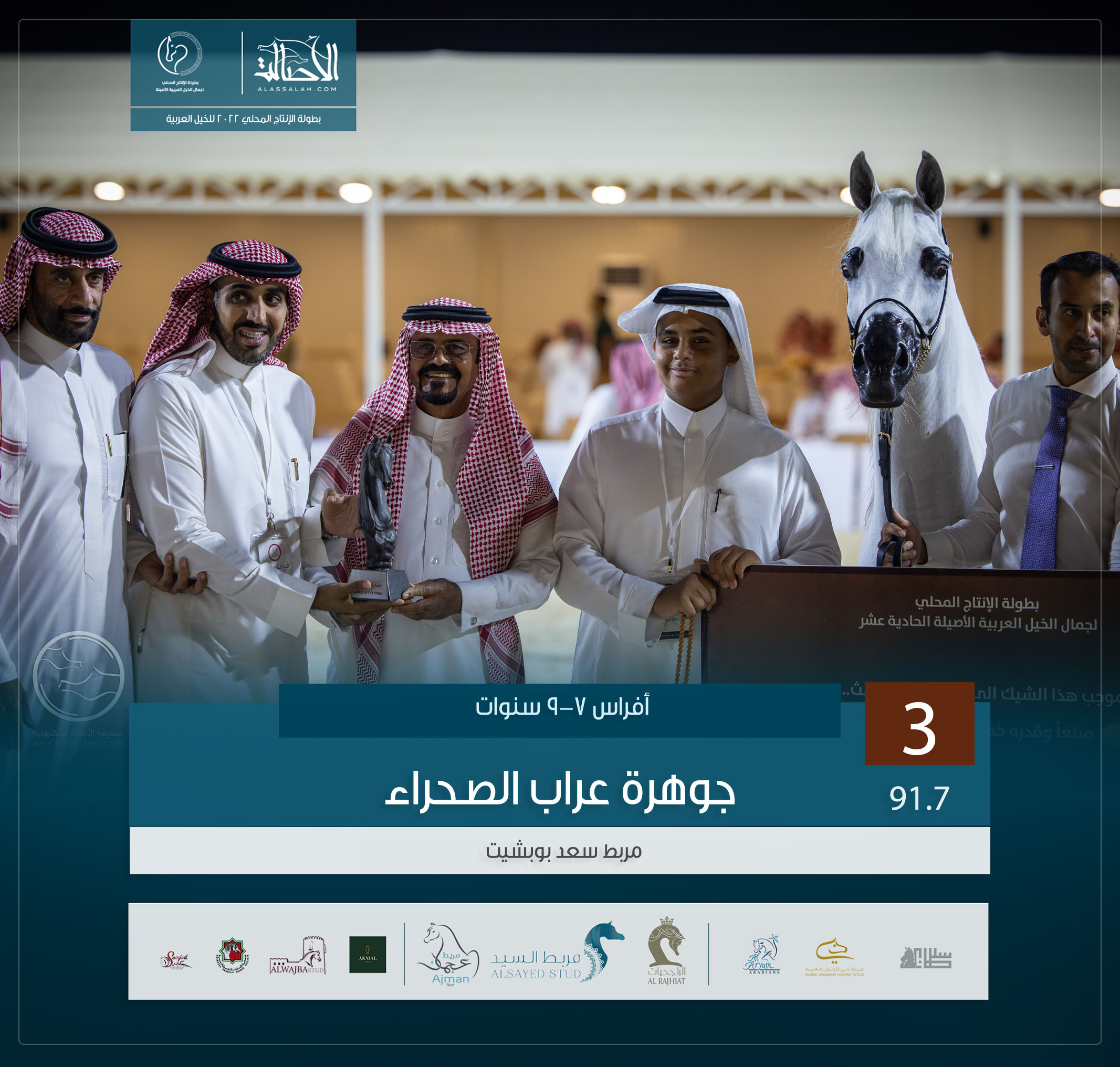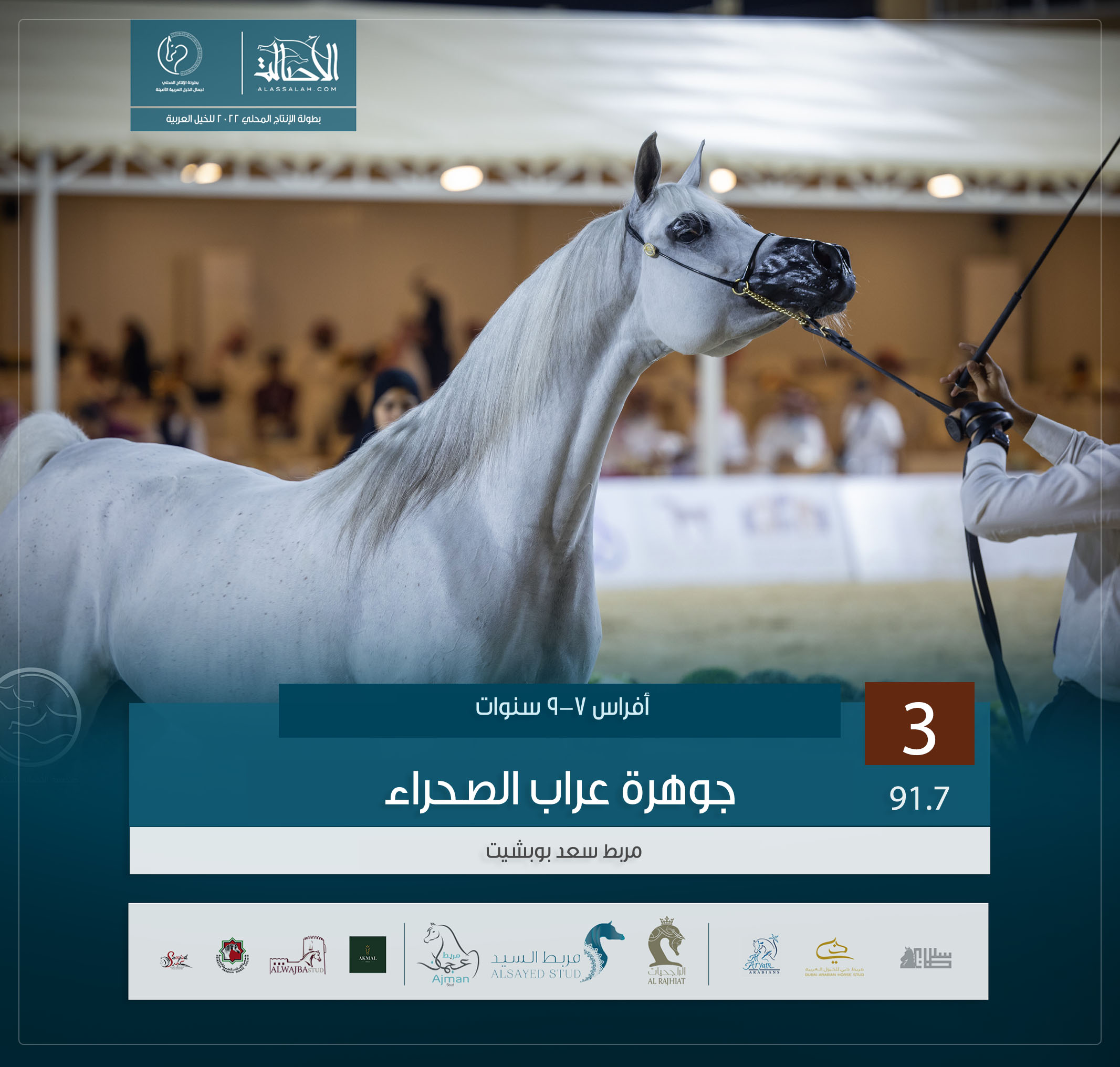 المركز الثالث:جوهرة عراب الصحراء ( نوار الصافنات x كريمة الشقب) مربط سعد صالح بوبشيت. 91.70 نقطة.