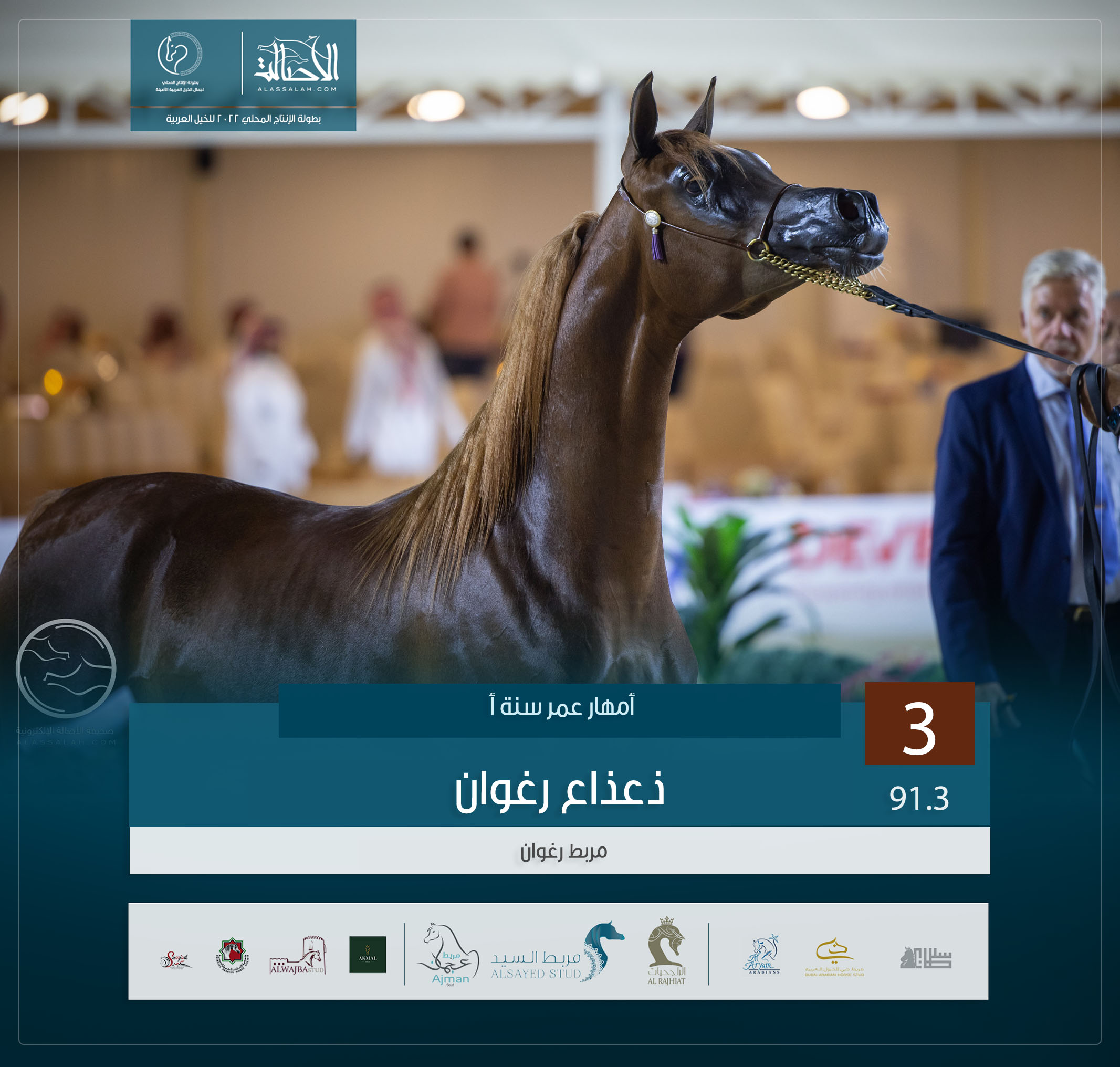 المركز الثالث: ذعذاع رغوان (كنز البداير x ريان المعود) مربط رغوان. 91.30 نقطة.