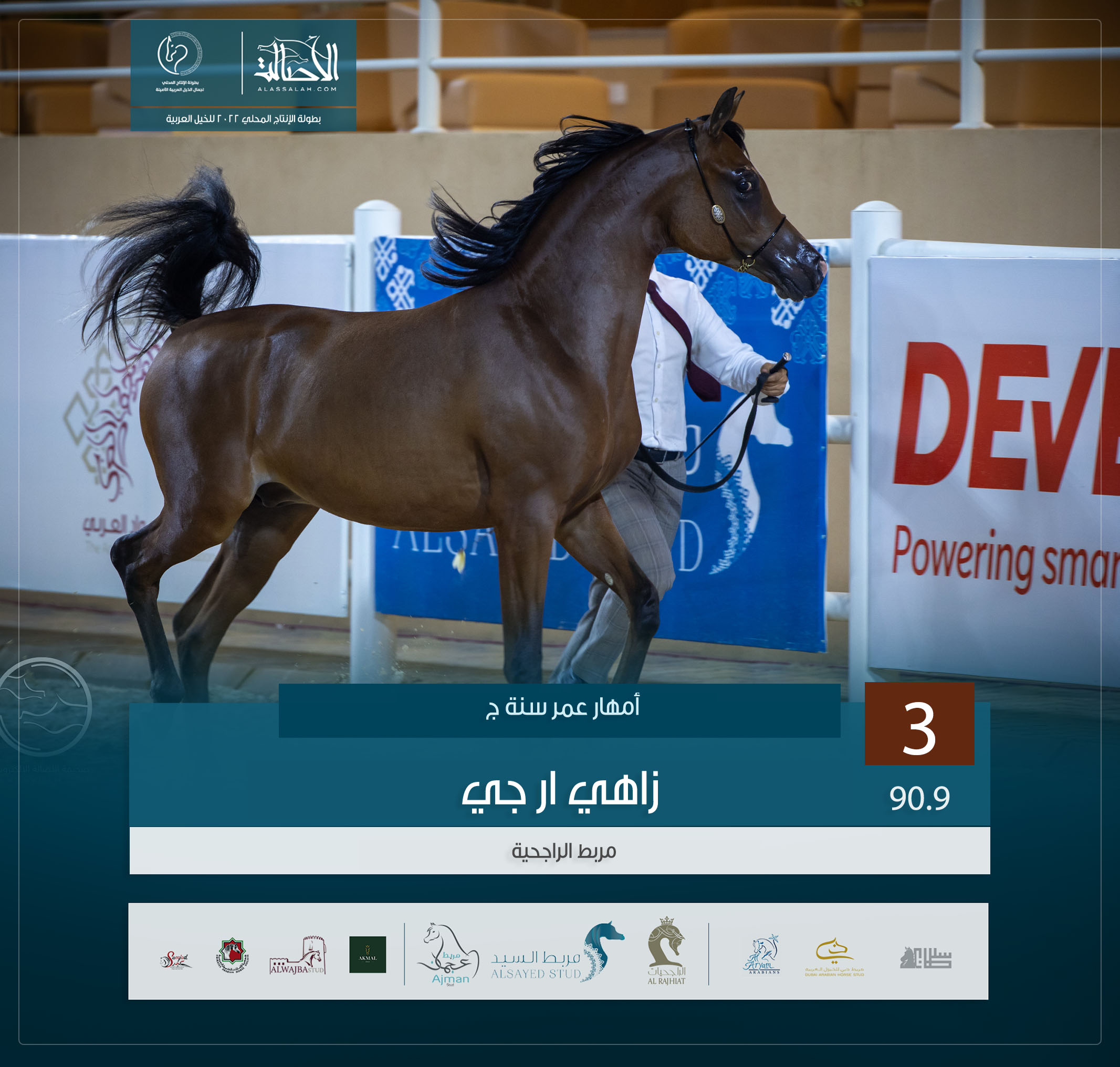 المركز الثالث: زاهي ا جيه (كنز البداير x زيركوتا كيه ايه) مربط الراجحيه. 90.90 نقطة.
