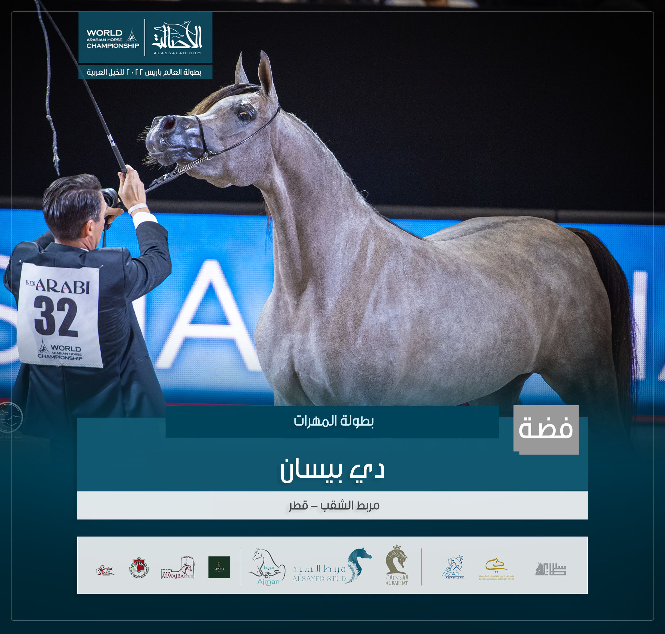 اختتمت اليوم السبت 19 نوفمبر 2022 فعاليات بطولة العالم للخيل العربية الأصيلة 2022، في نسختها الـ 41، التي أقيمت على مدى 3 أيام بمعرض باريس بارك لوبورجيه، بالعاصمة الفرنسية باريس. وتعد البطولة التي تصنف حسب أنظمة وقوانين (الإيكاهو) بتصنيف الألقاب “تايتل شو”، من أقوى بطولات العالم على الإطلاق، وتشارك فيها صفوة الخيول العربية الأصيلة المملوكة لأعرق المرابط.