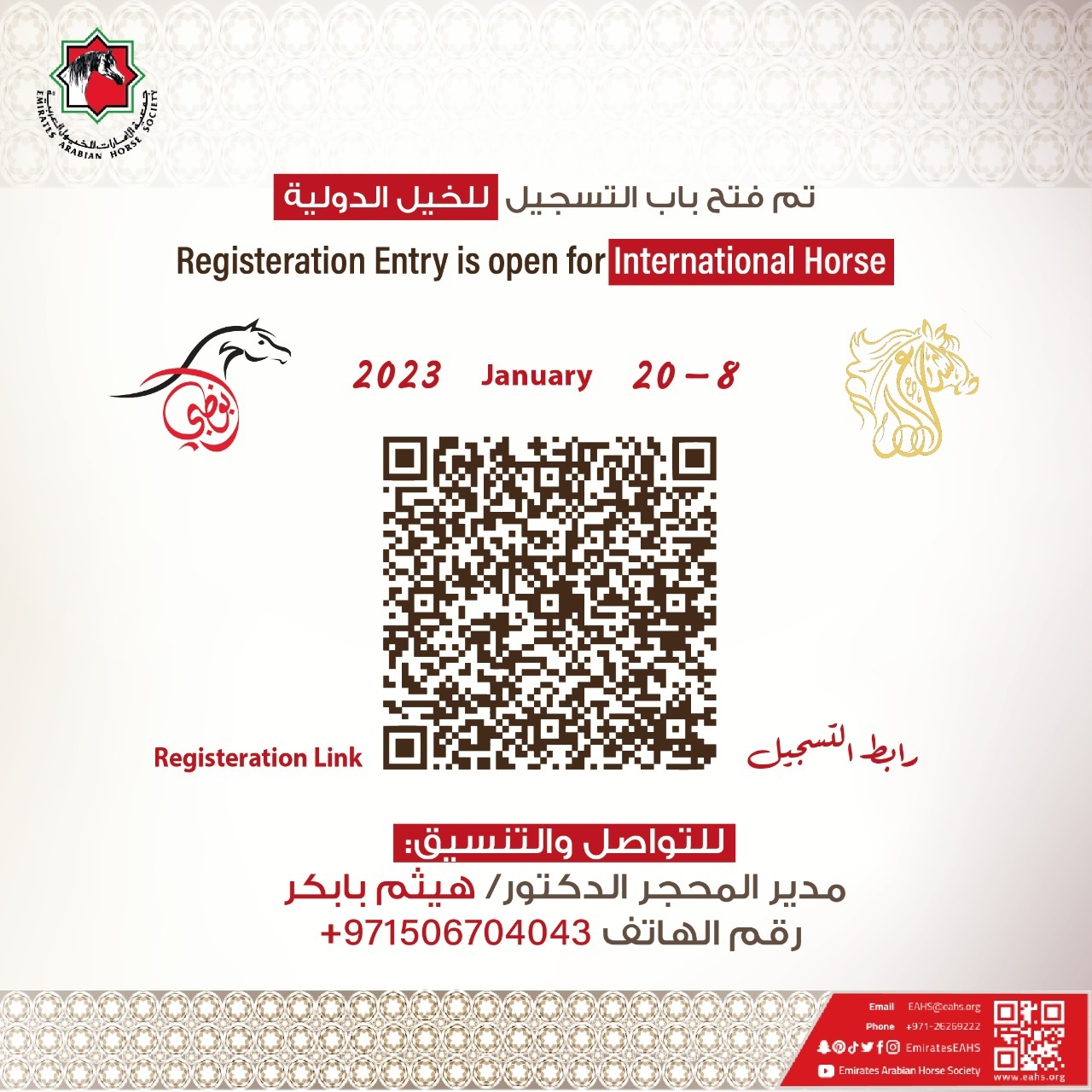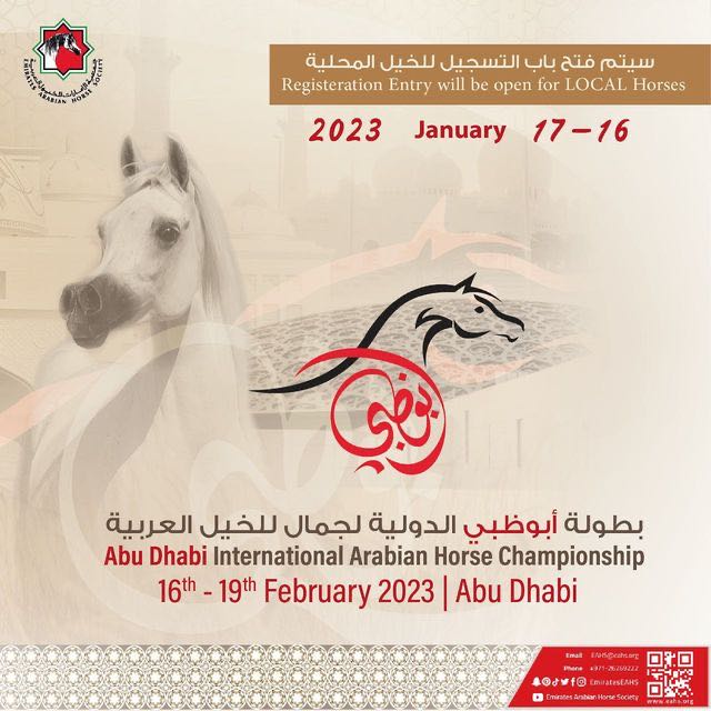 أعلنت جمعية الإمارات للخيول العربية عن فتح باب التسجيل للمشاركة في كل من بطولة أبوظبي الدولية لجمال الخيل العربية 2023 التي ستقام في الفترة من ( 16- 19 فبراير 2023). وبطولة الشراع الدولية التي ستقام في الفترة من ( 23- 26 فبراير 2023).