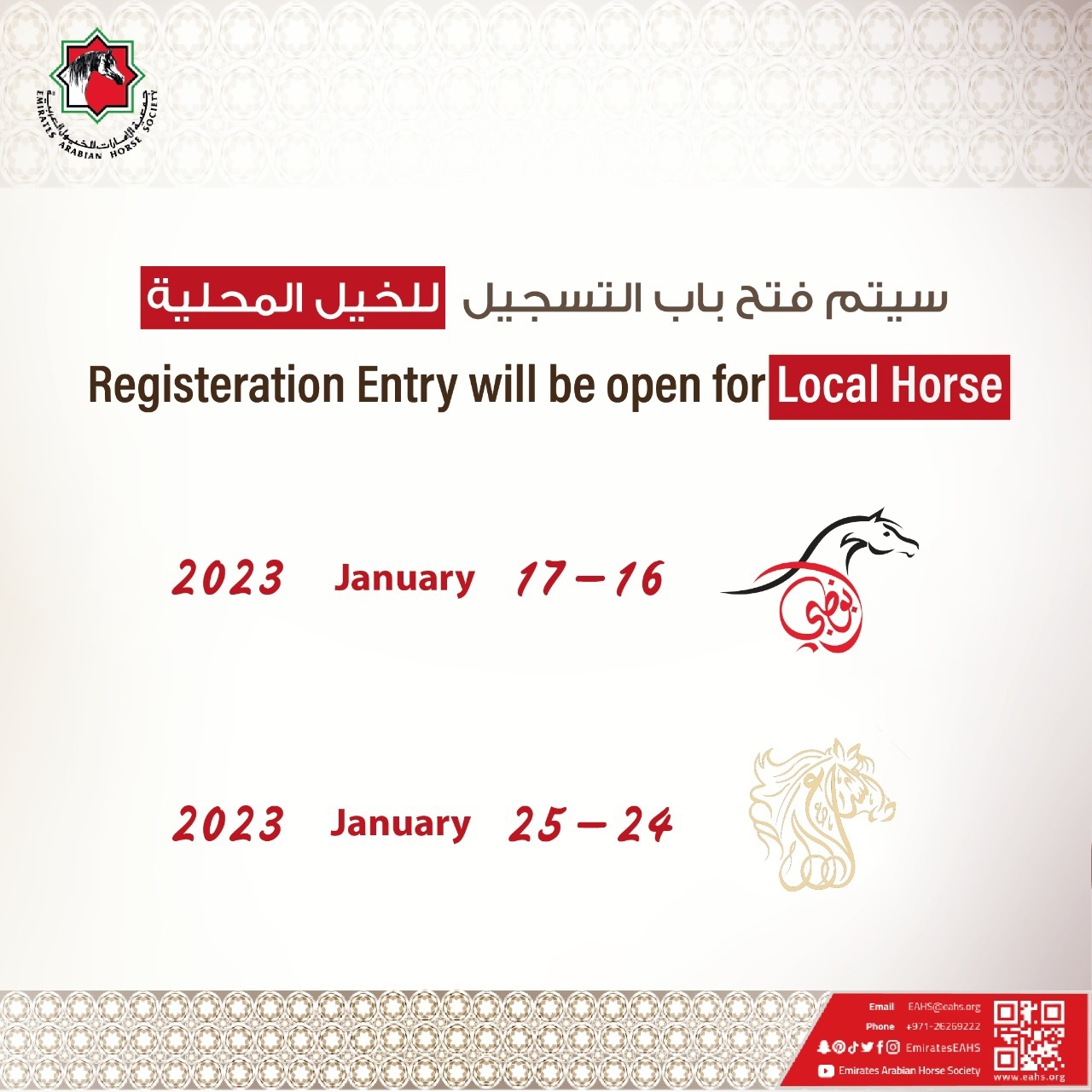 وأعلنت الجمعية أن فتح باب التسجيل للمشاركة في البطولتين سيكون في الفترة من 8 -20 يناير 2023 للخيول الدولية، وبالنسبة للخيول المحلية سيكون التسجيل لبطولة أبوظبي يومي 16و17 يناير 2023، أما التسجيل للخيول المحلية لبطولة الشراع سيكون يومي 24 و25 يناير 2023.
