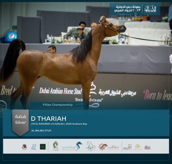 اهدت دي ذارية مربط الوجبة اللقب الفضي للمهرات في بطولة دبي الدولية للجواد العربي في نسختها العشرون التي اختتمت مساء اليوم الأحد 19 مارس 2023 ، ونظمتها لجنة تنظيم فعاليات وبطولات جمال الخيول العربية الأصيلة بدبي، بقاعة زعبيل بمركز دبي التجاري العالمي.