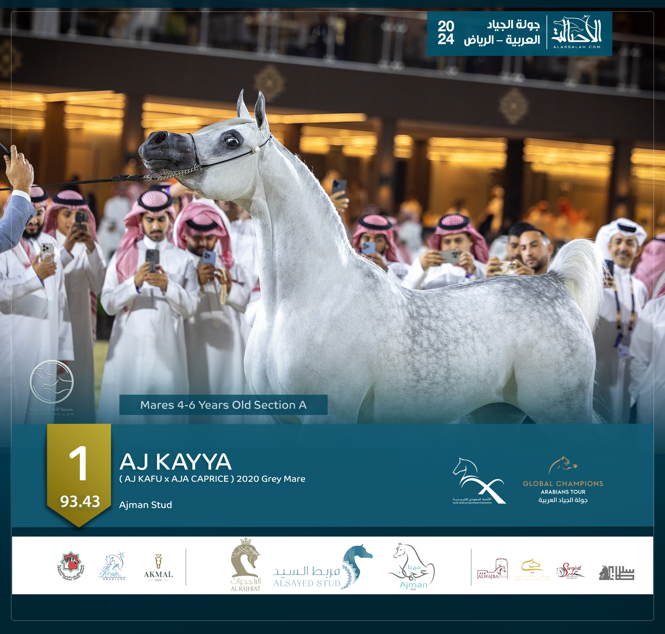 - الأول: ع ج كايا (ع ج كفو X اجا كابريس) 93.43، مربط عجمان- الإمارات.