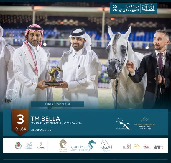- الثالث: تي ام بيلا (تي ام ايتيبو X تي ام فضيلة) 91.64، مربط الجميل- قطر.