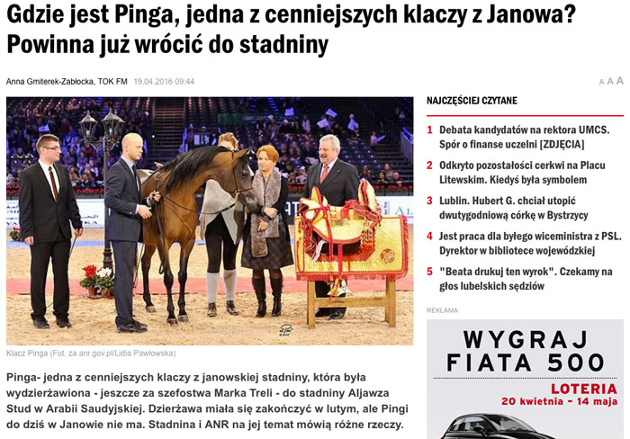 Pinga, one of the most valuable mare in Janów Stud, was leased to Aljawza Stud in Saudi Arabia. Rent had to be completed in February, but Pinga is not now in Janów.