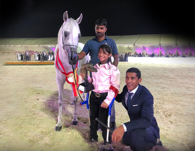 In a human and generous gesture by Al Khalid Stud and the exhibitorNabil Al Sobhi towards the young Dina Al Obaidi, a special needs child – was awarded the gold medal won by filly “Sahla Al Khaled” in the Gulf Straight Egyptian Cup, during the second edition of the Asharqia Arabian Classic which was held for five days at the Dhahran Expo. The story behind Dina receiving this award began when Al Sobhi met her before the final day and promised her the golden award if he happened to receive one and indeed after his filly won Al Sobhi headed directly to the attendance and brought Dina over to the center to claim the prize.